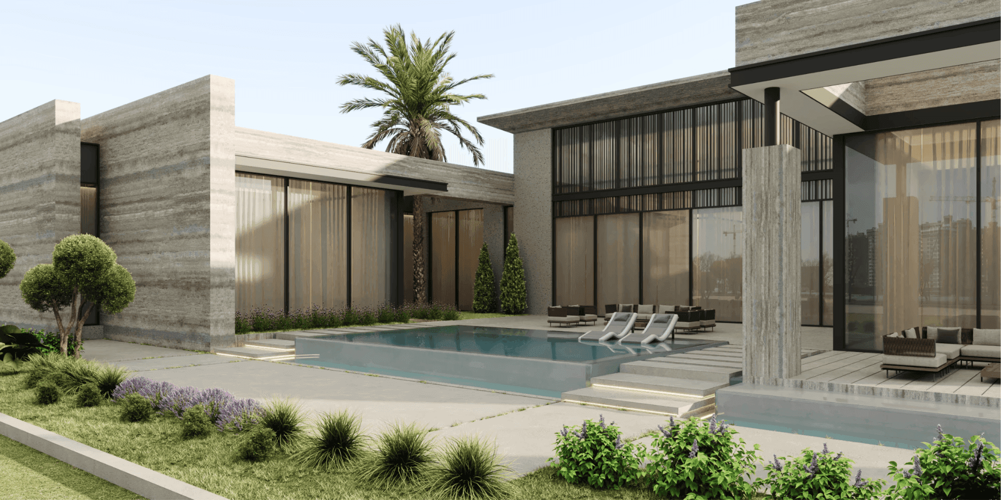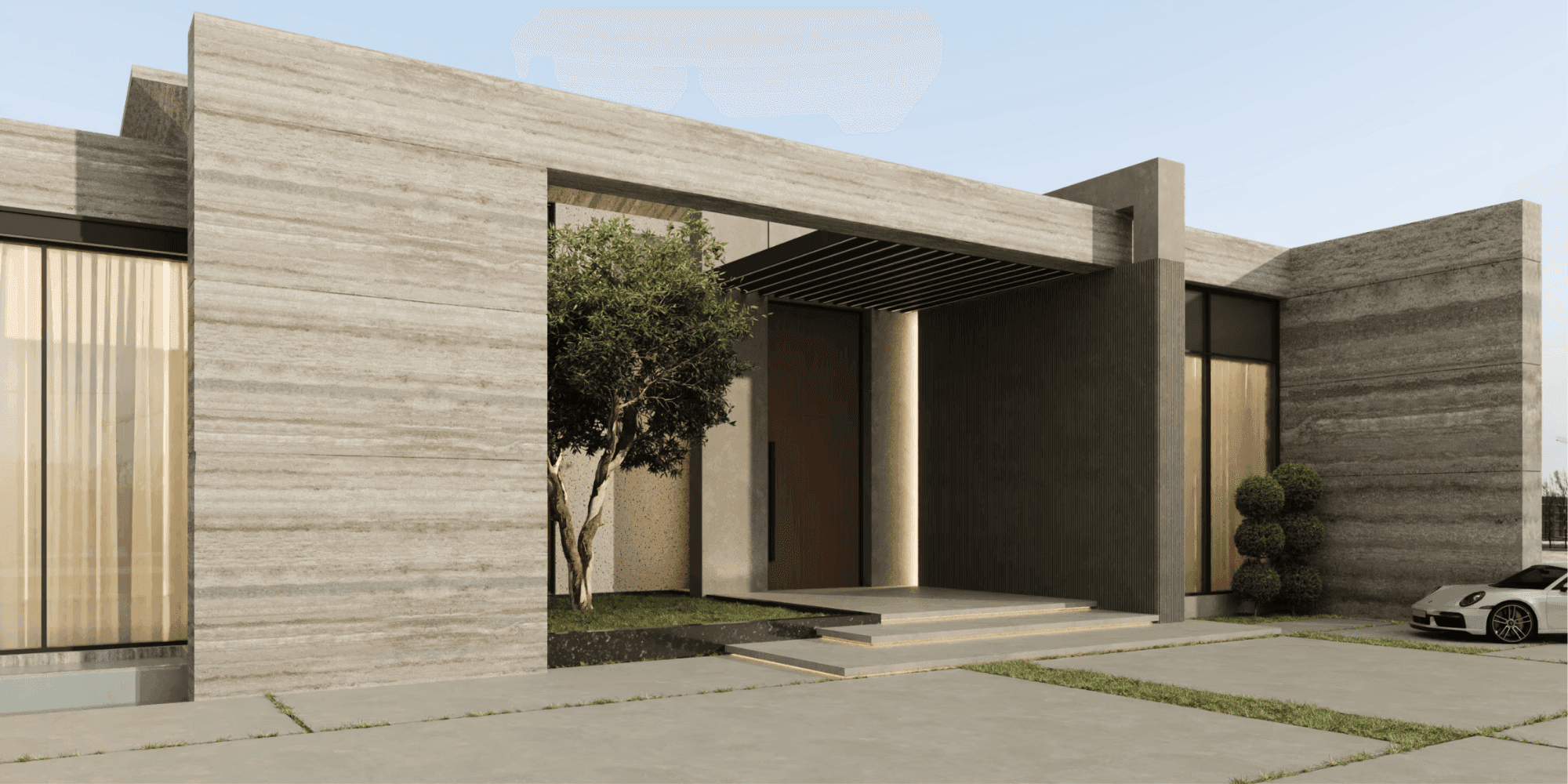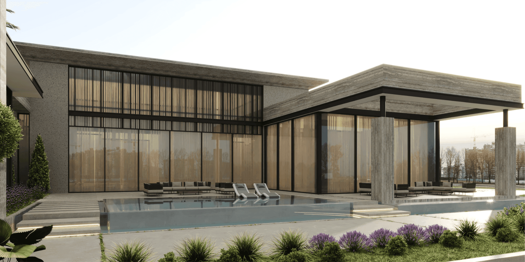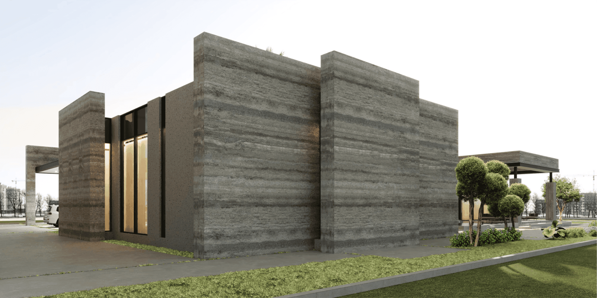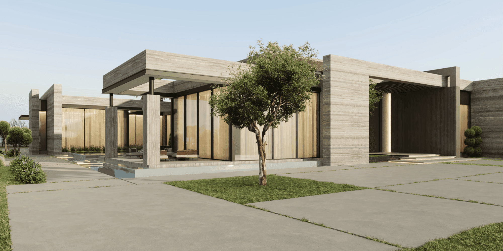 The design concept emphasizes clean geometry, horizontal massing, and material honesty. Solid volumes are carefully composed with recessed glazing and landscaped courtyards to create depth and visual rhythm. The architectural language focuses on minimalism and proportion, resulting in an exterior that feels calm, confident, and architecturally striking.