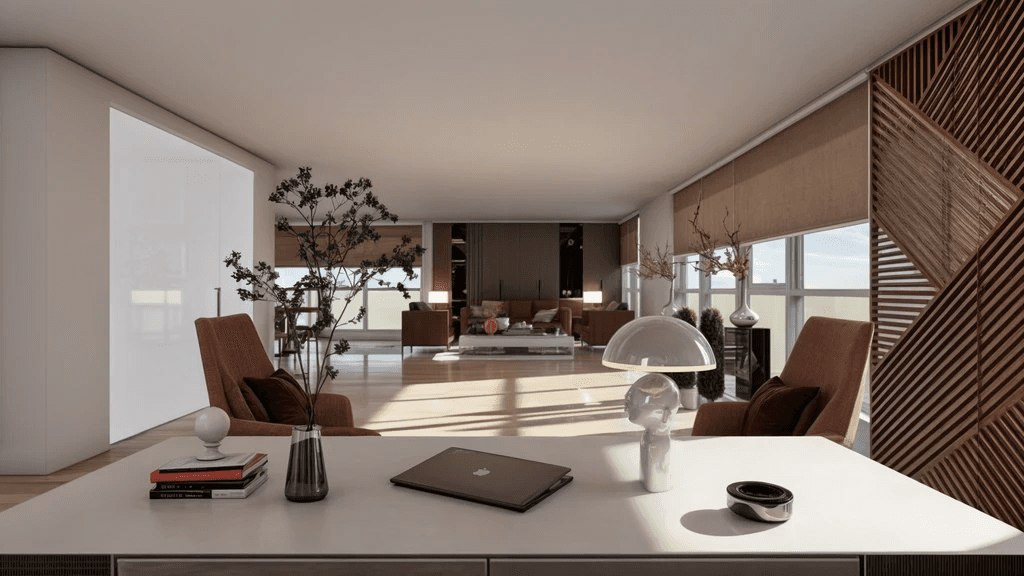 A neutral palette of beige, soft white, and warm brown tones was used to create a timeless and professional atmosphere, supported by darker accents for contrast and depth.