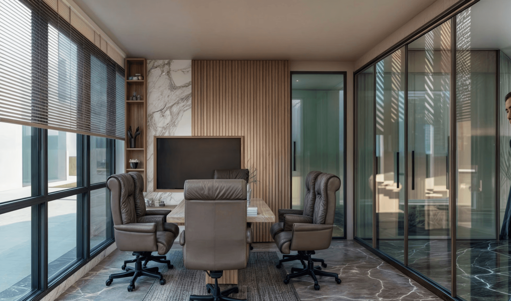 The project features natural wood paneling, stone surfaces, glass partitions, and subtle metal details. These materials were selected for durability, elegance, and suitability for a corporate-industrial environment.