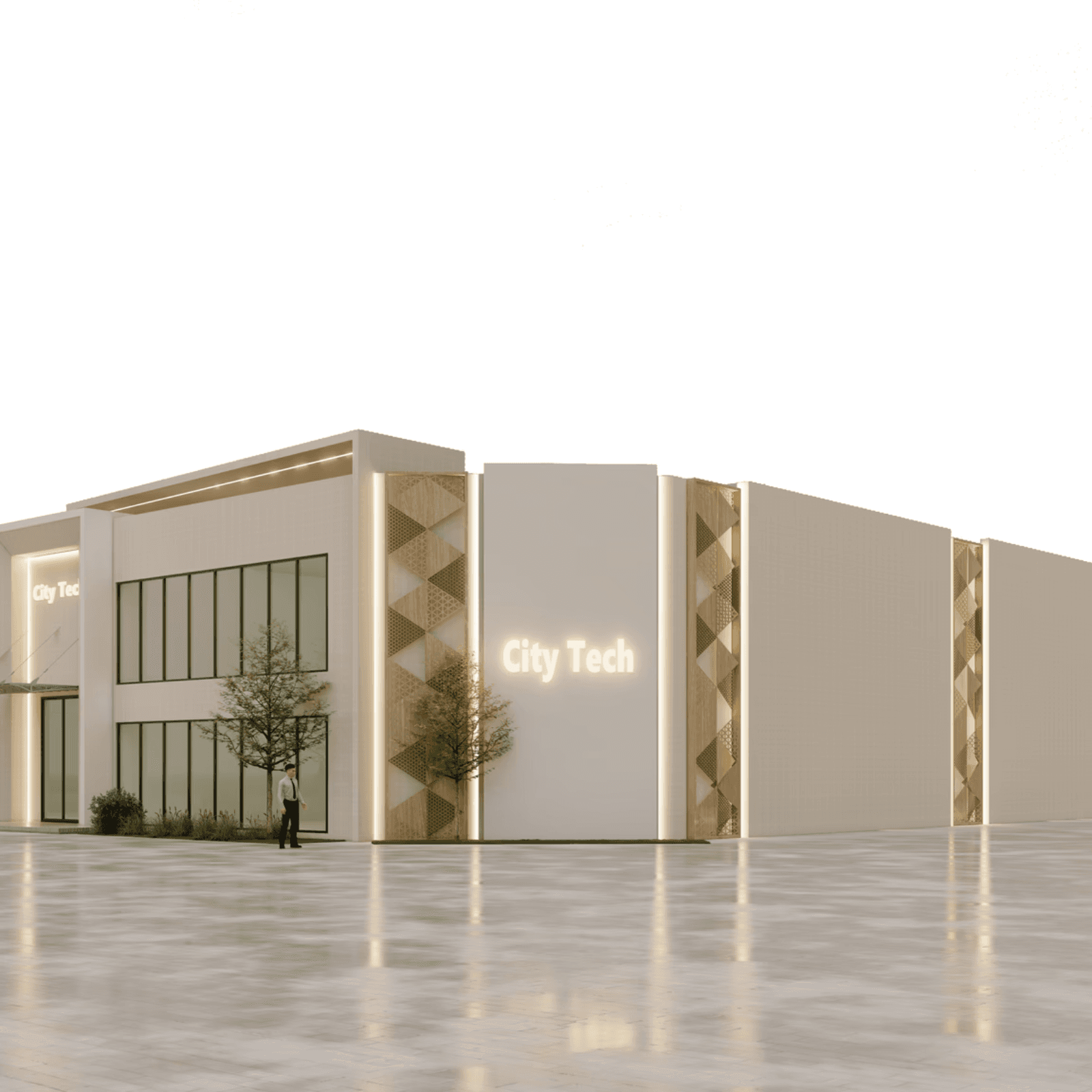 The primary structure is composed of simple, well-defined volumes arranged to establish a clear hierarchy between public, semi-public, and service areas. The form ensures efficient internal planning while projecting a professional corporate identity.