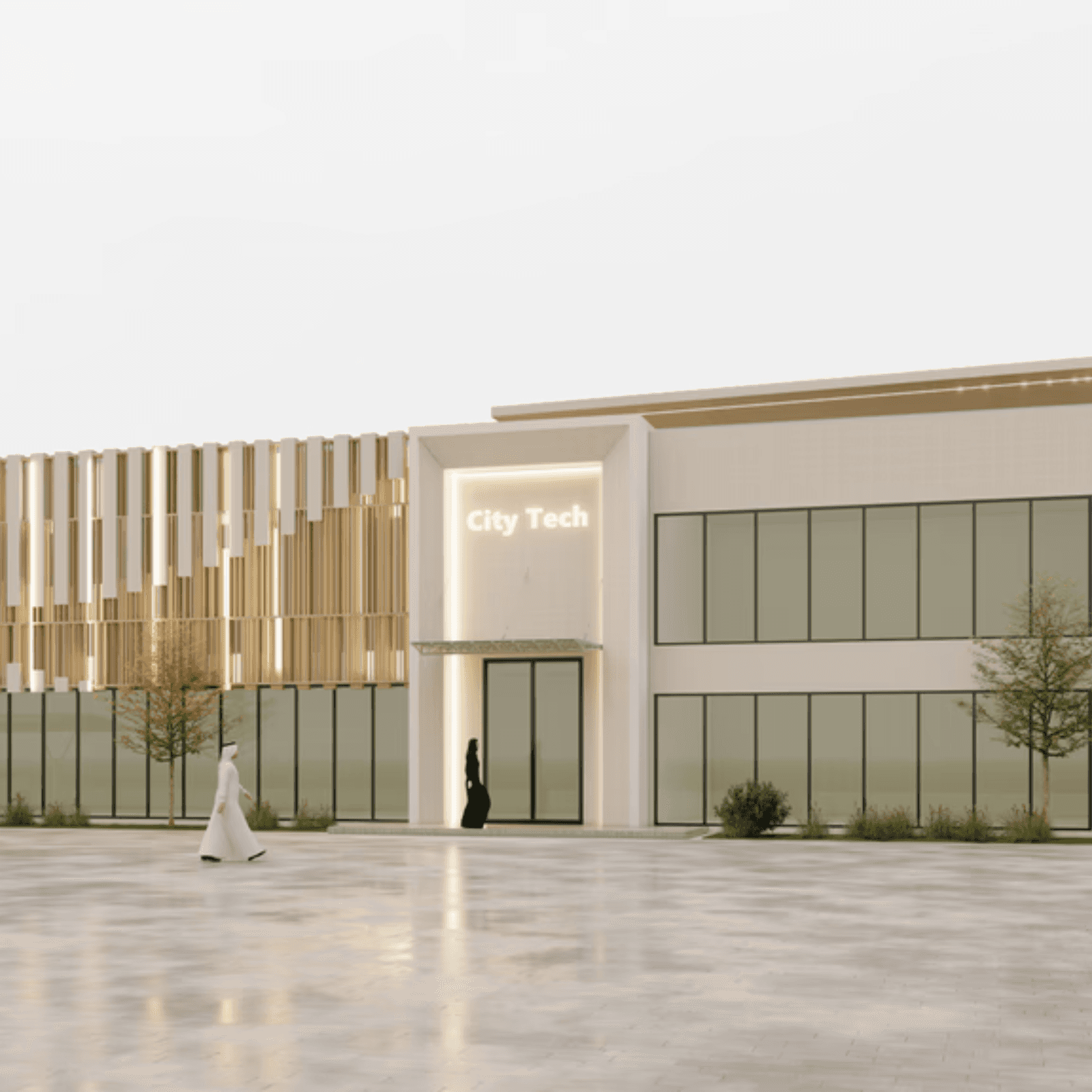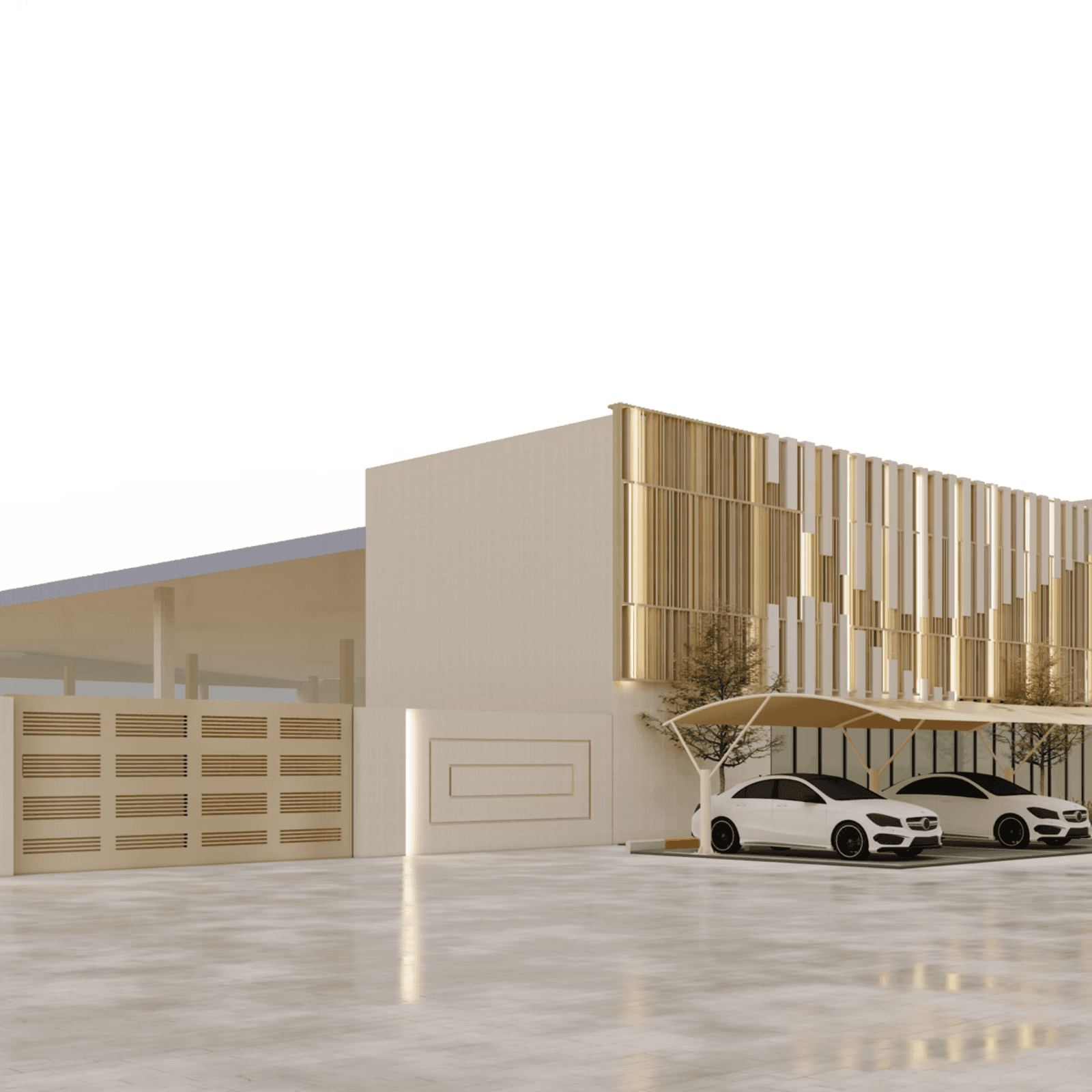 The main entrance is highlighted through vertical architectural elements and lighting integration, creating a welcoming and recognizable arrival point. Pedestrian and vehicular movements are clearly separated to improve safety and circulation.