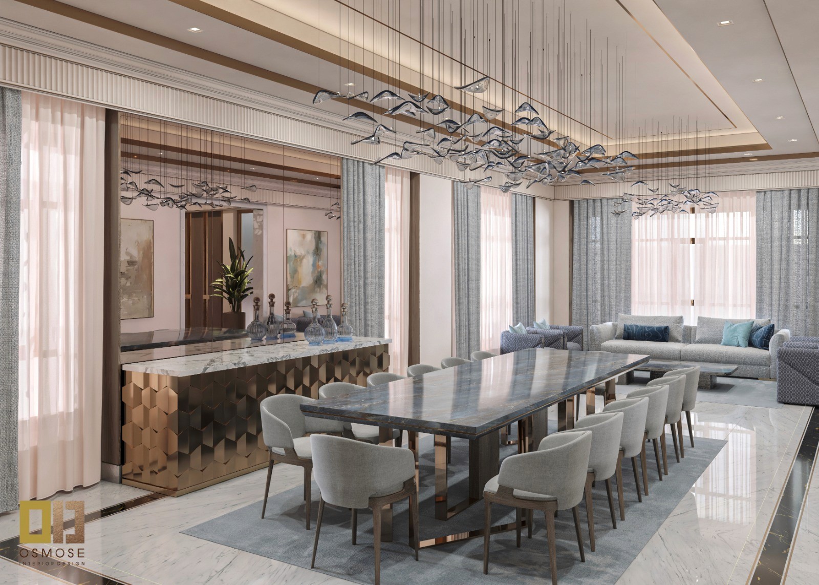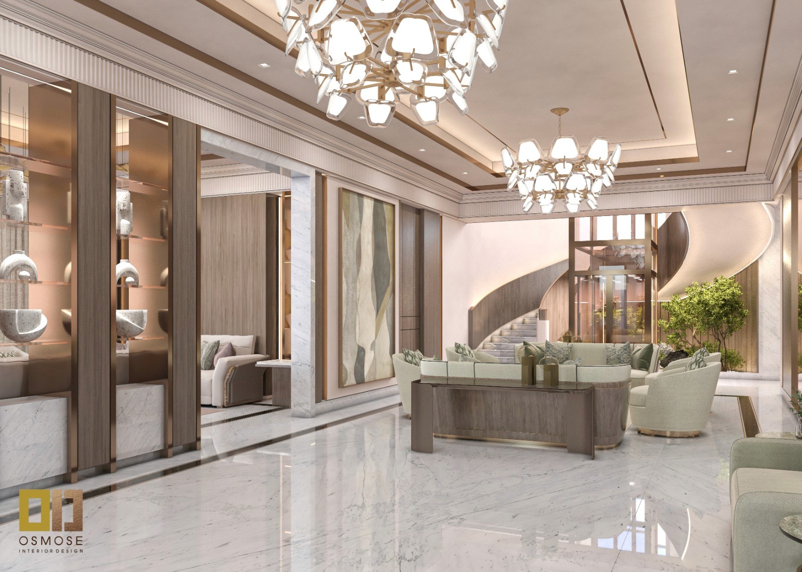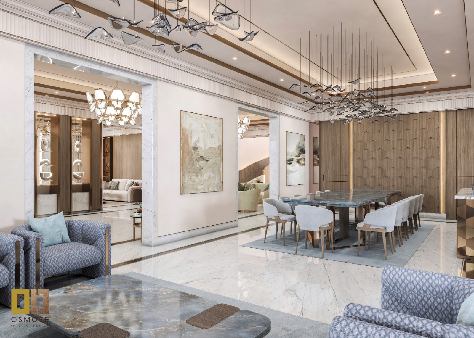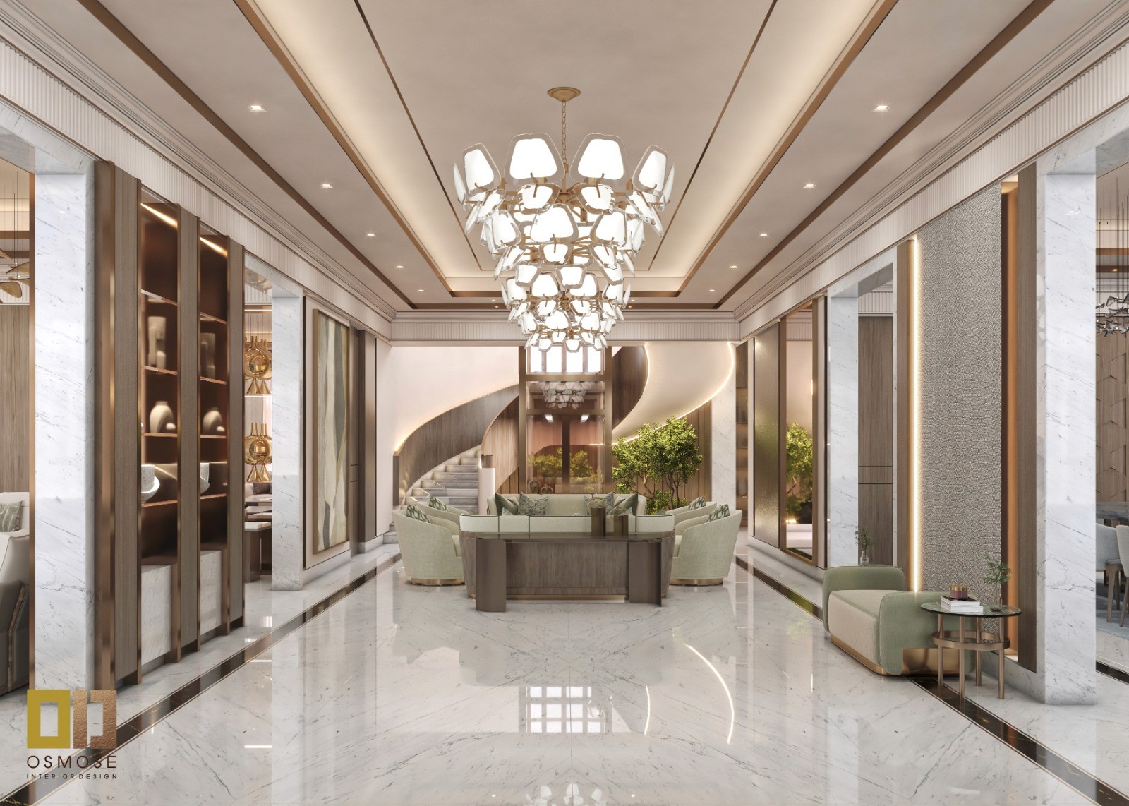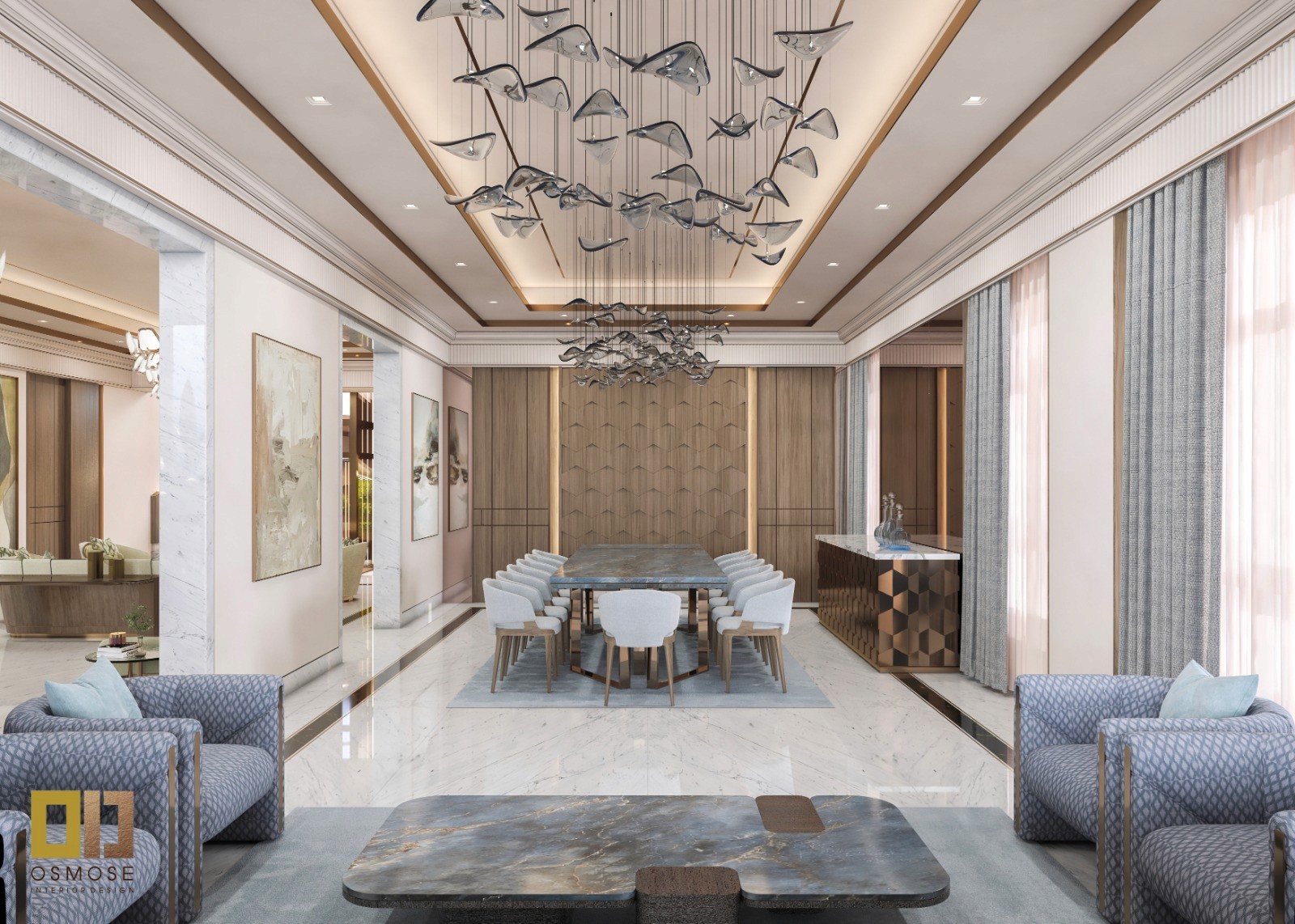 Premium marble flooring, textured wall panels, warm wood finishes, and metallic highlights are used throughout the space. These materials add richness, durability, and a timeless luxury appeal.