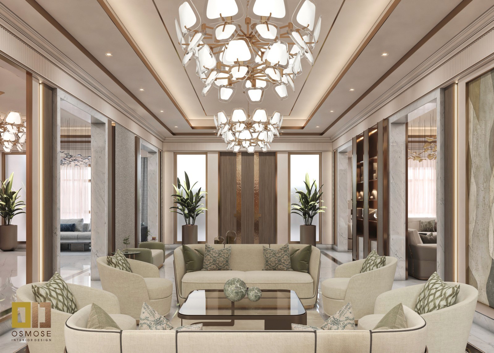 Plush sofas and armchairs are positioned around marble coffee tables, creating a balanced and comfortable seating composition. The arrangement allows smooth circulation while preserving a sense of luxury and formality.