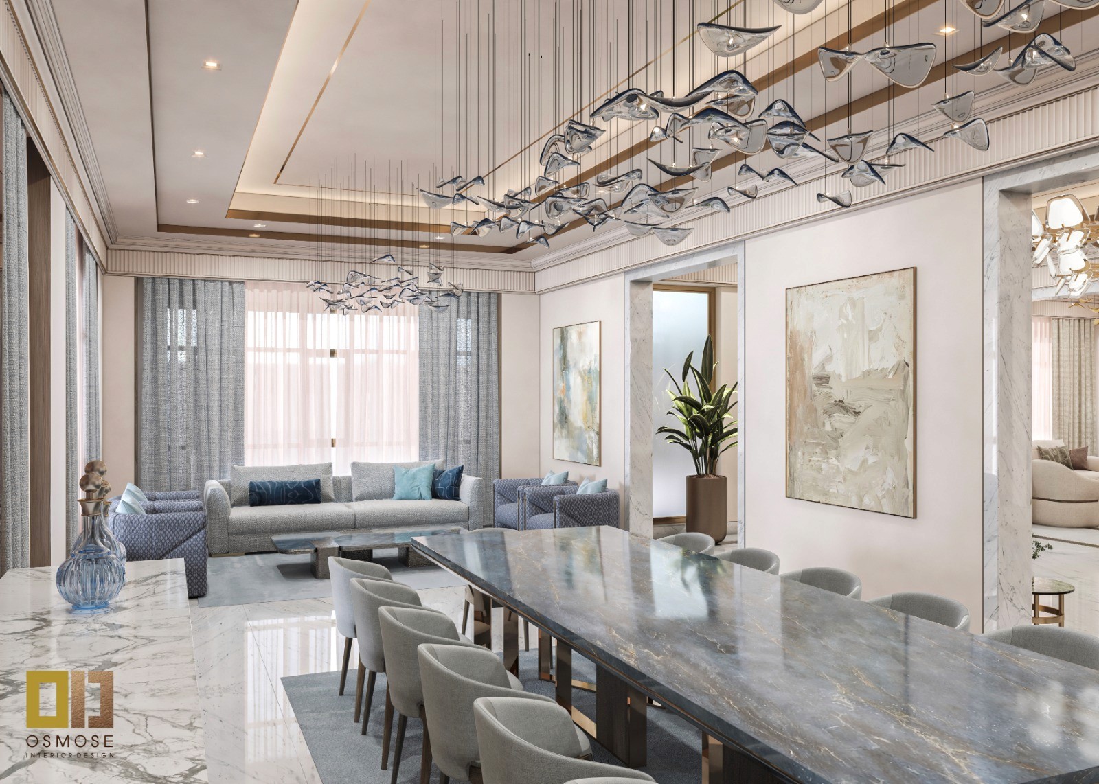 Custom-designed sofas, marble-topped tables, and curated décor elements define the space. Accessories are selected to complement the interior without overwhelming the architectural composition.