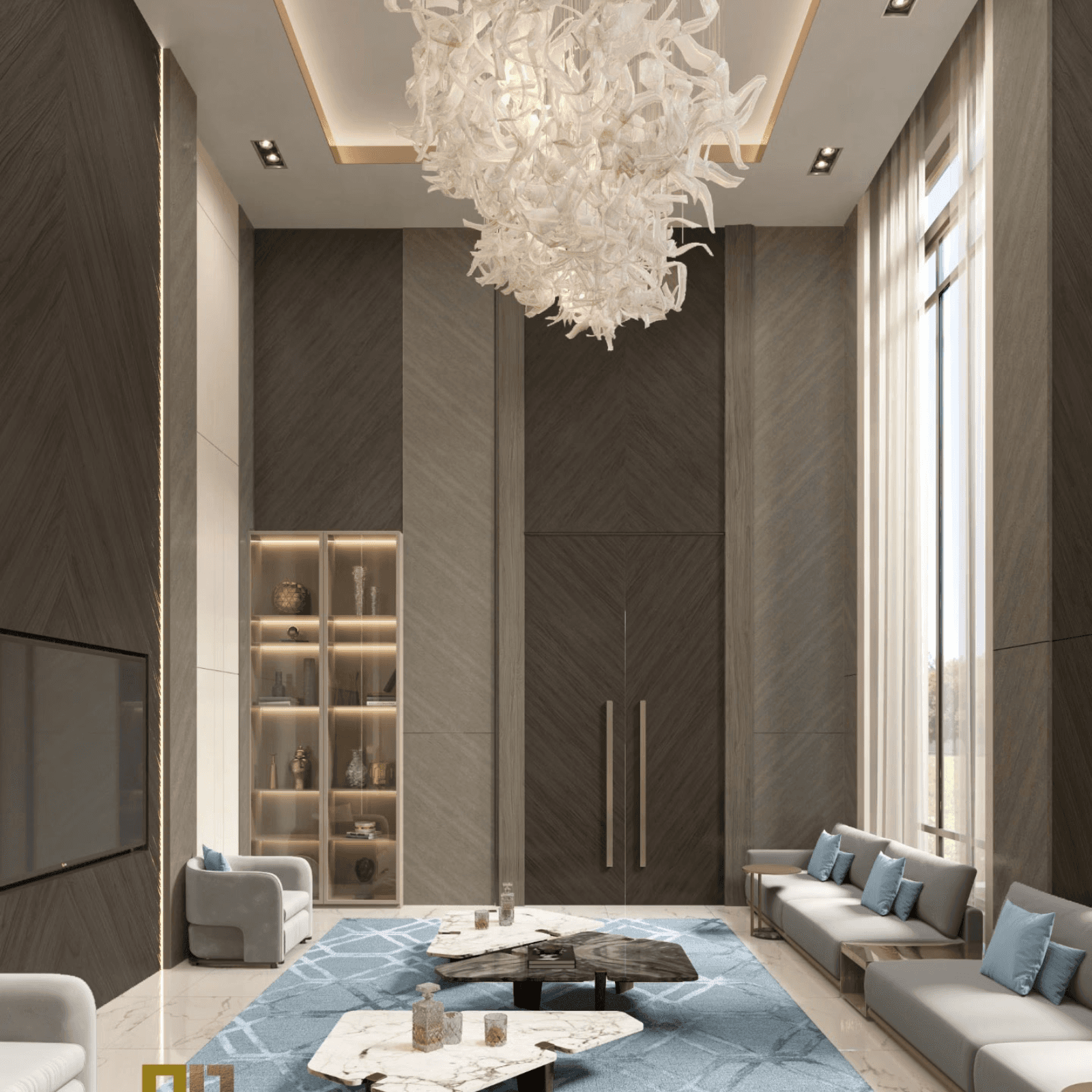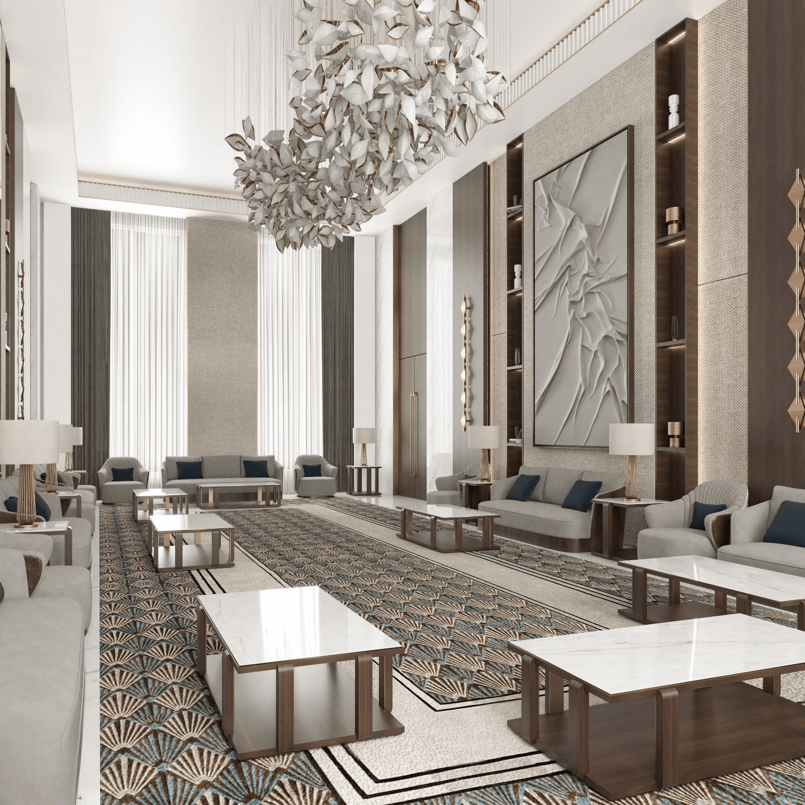 Layered lighting combines recessed ceiling fixtures, concealed LED strips, and a sculptural chandelier. This lighting approach highlights architectural elements while creating a warm and welcoming ambiance throughout the majlis.