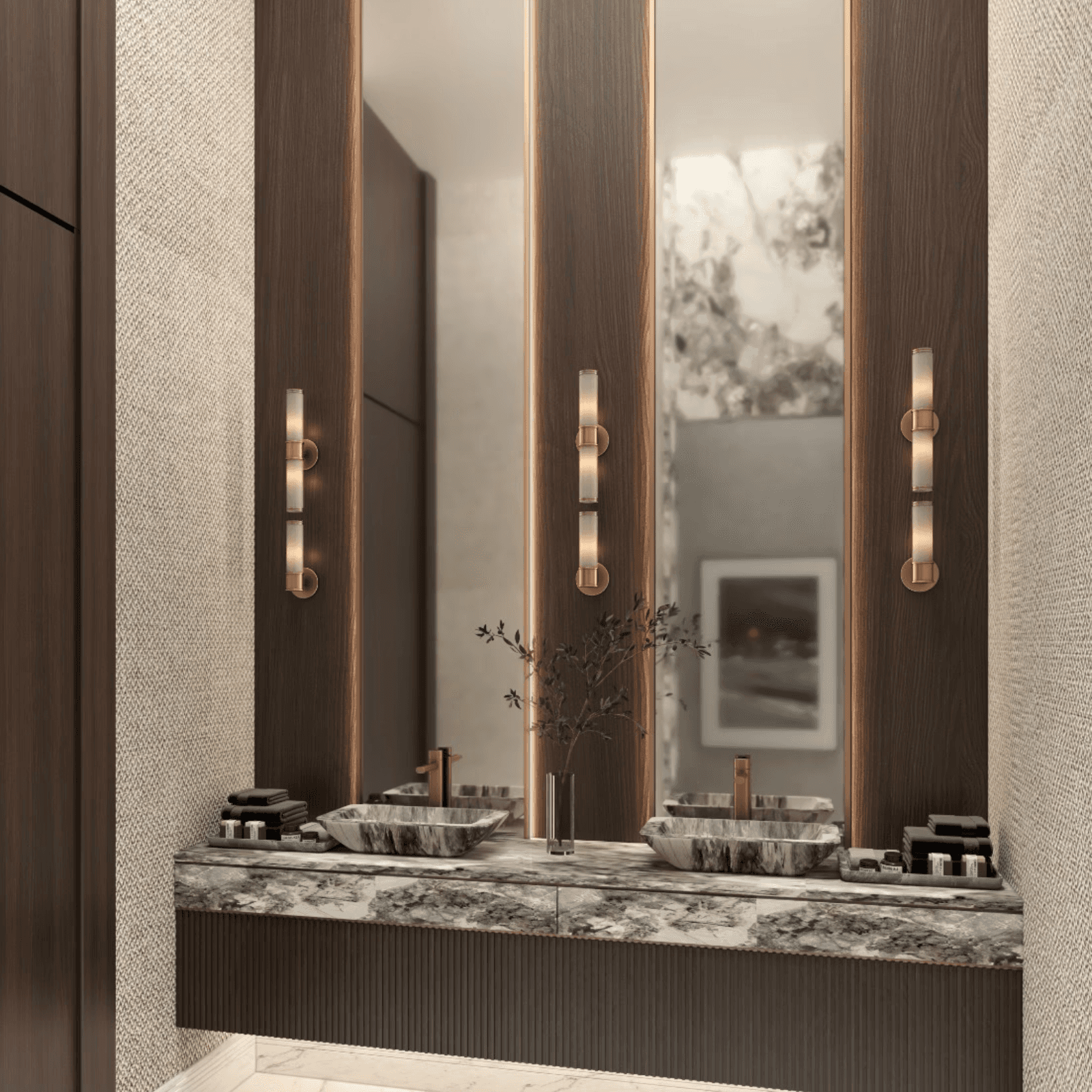 The interior features marble-finished wall panels, textured surfaces, and warm wood elements. These materials provide richness, durability, and a luxurious tactile experience suitable for a formal majlis.