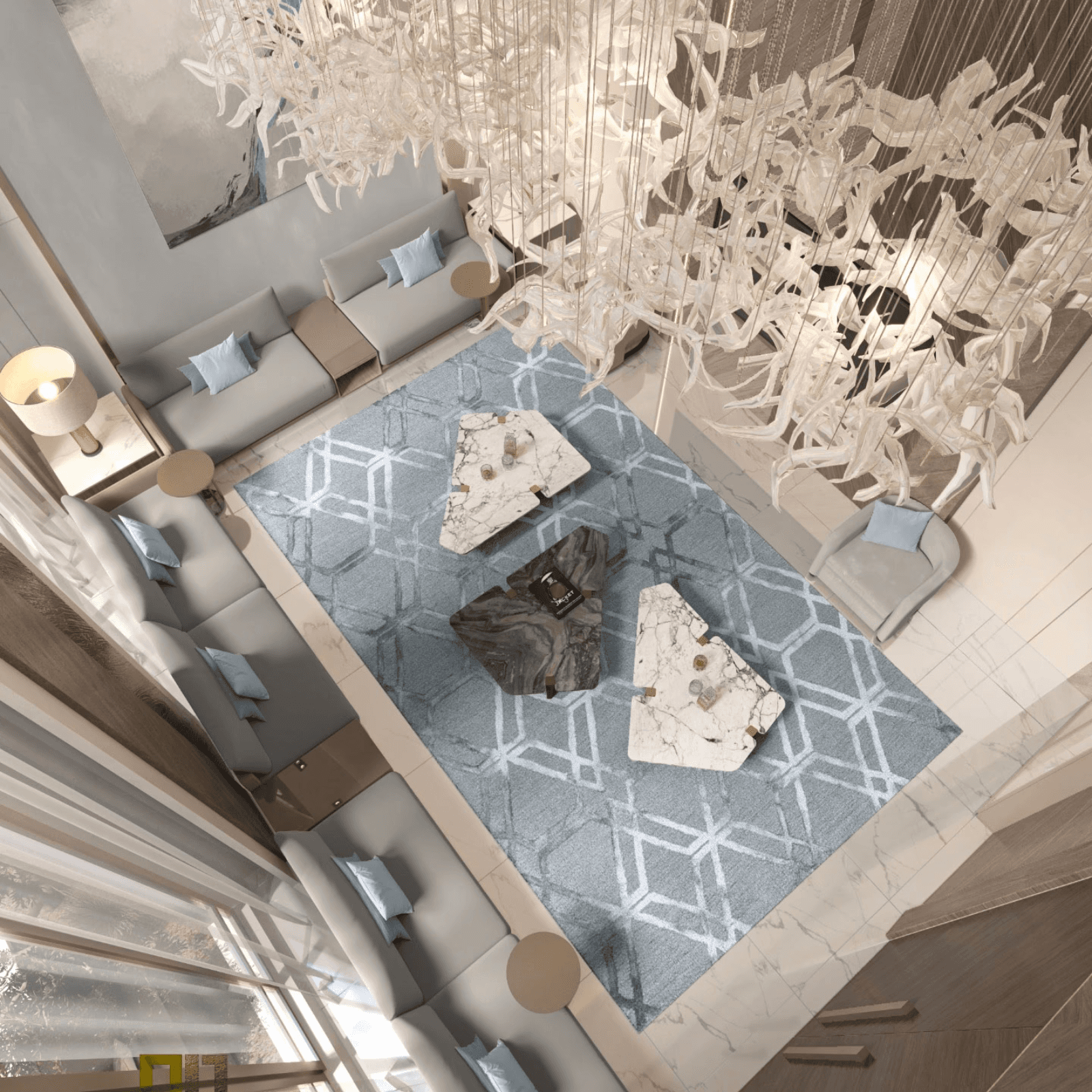 Custom-designed seating with plush upholstery ensures comfort during long gatherings. Minimal accessories and carefully selected décor pieces maintain visual clarity and sophistication.