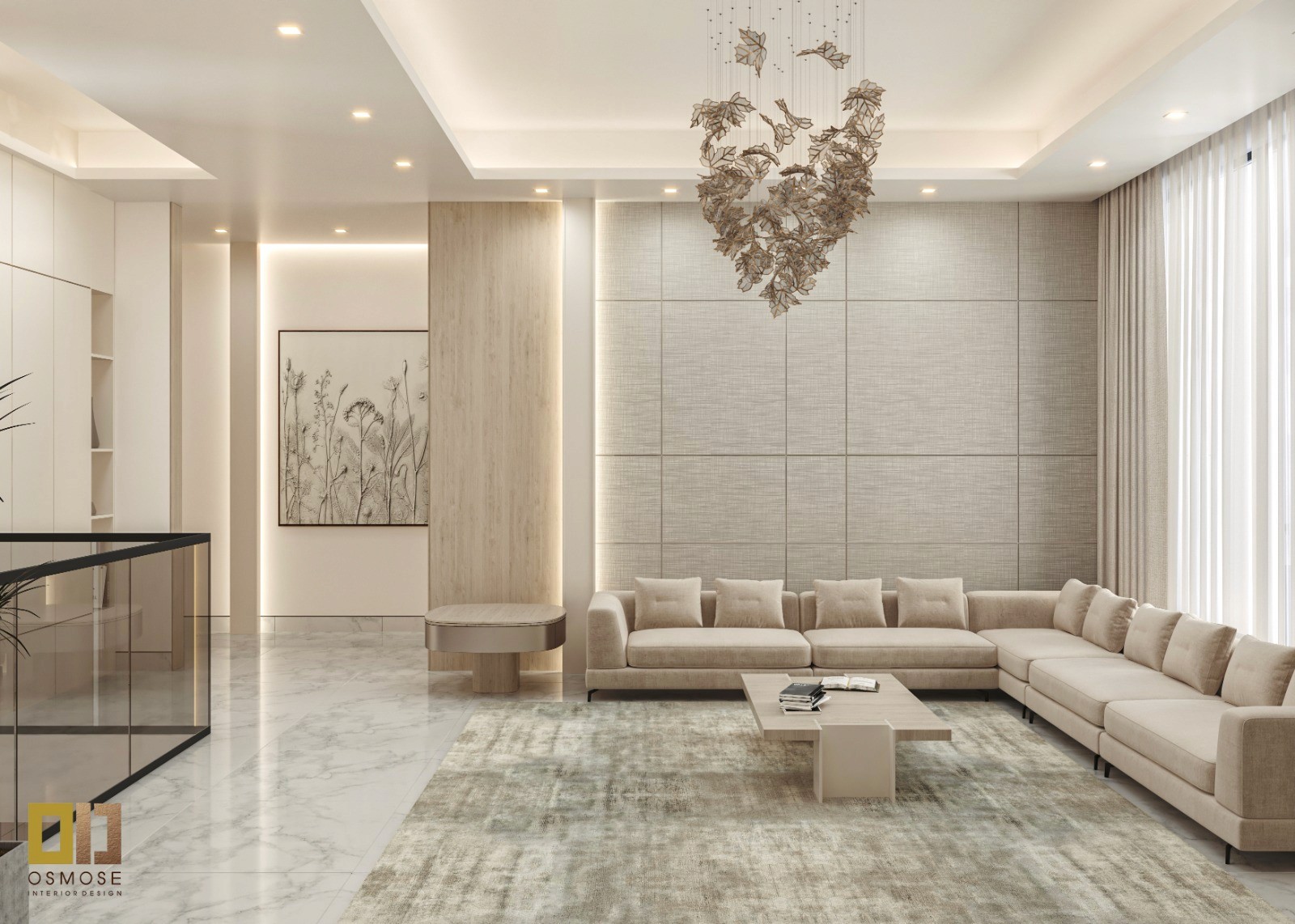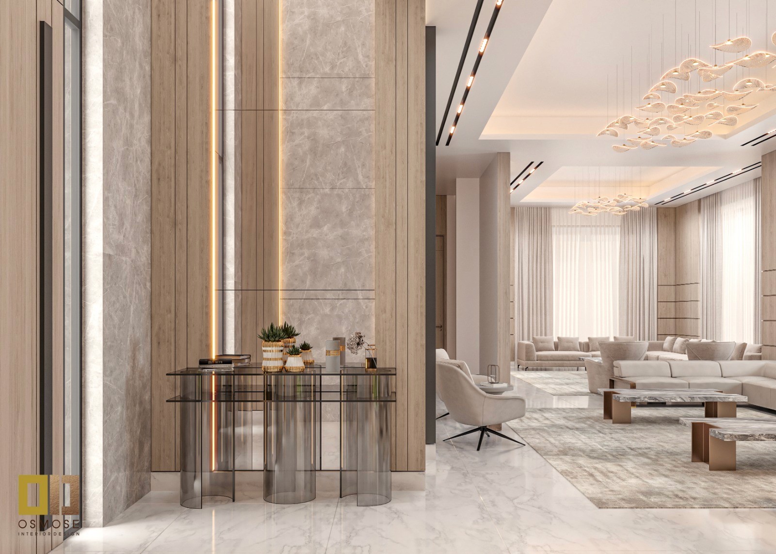 Custom-designed seating, sculptural coffee tables, and minimal decorative elements enhance the luxury feel without overpowering the design. Accessories are carefully curated to maintain clarity and elegance.