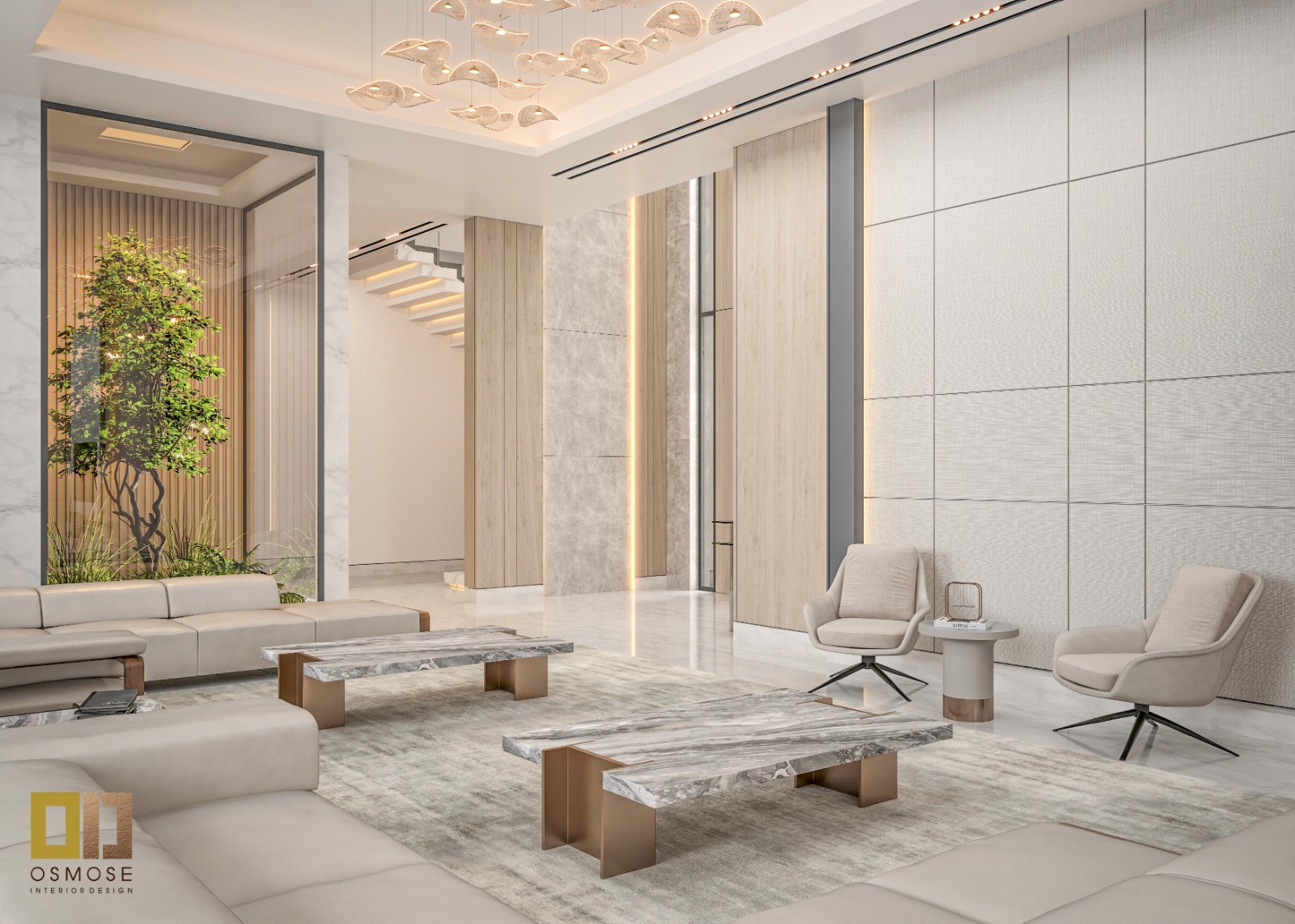 Polished stone flooring, textured wall panels, and marble-finished feature walls bring richness and durability to the space. Soft fabric upholstery adds warmth and comfort.