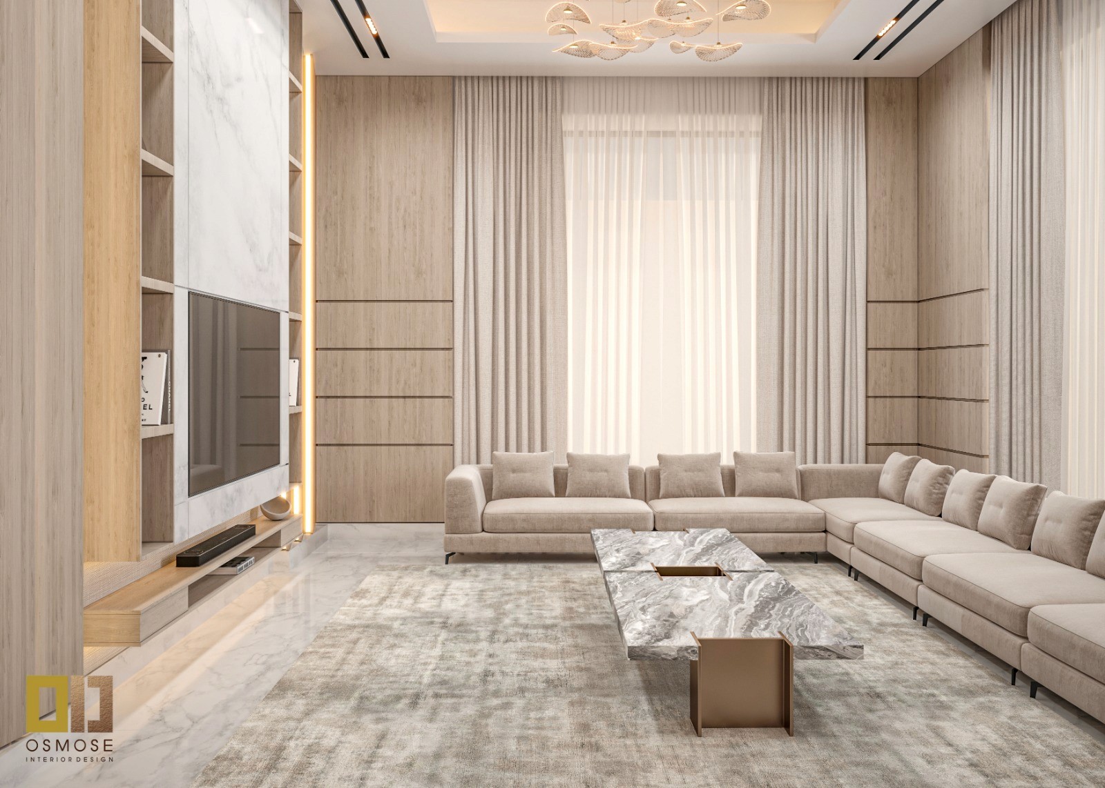The living area is designed as a grand yet comfortable space, anchored by a long, continuous seating arrangement that encourages conversation and relaxation. The open layout allows flexibility while maintaining a strong sense of order and balance.