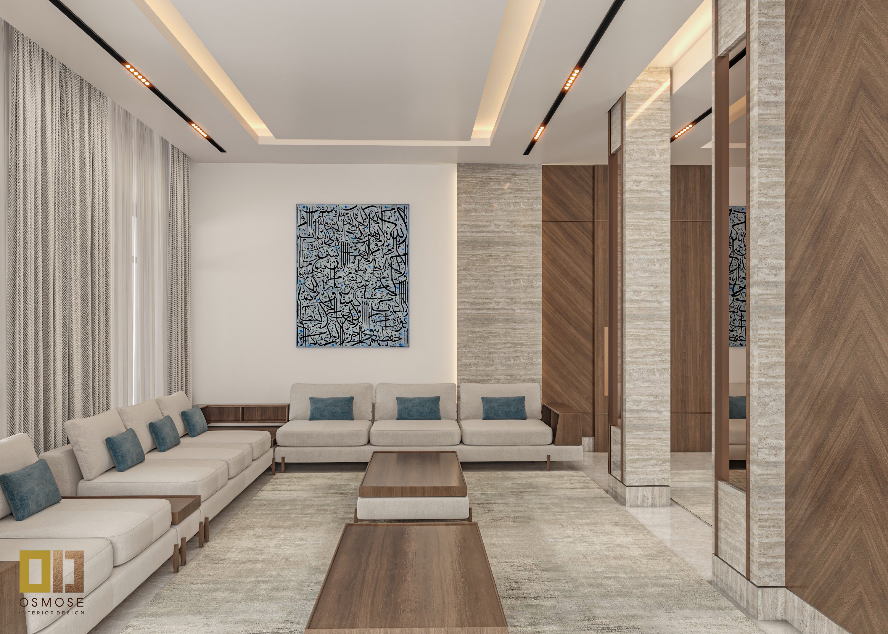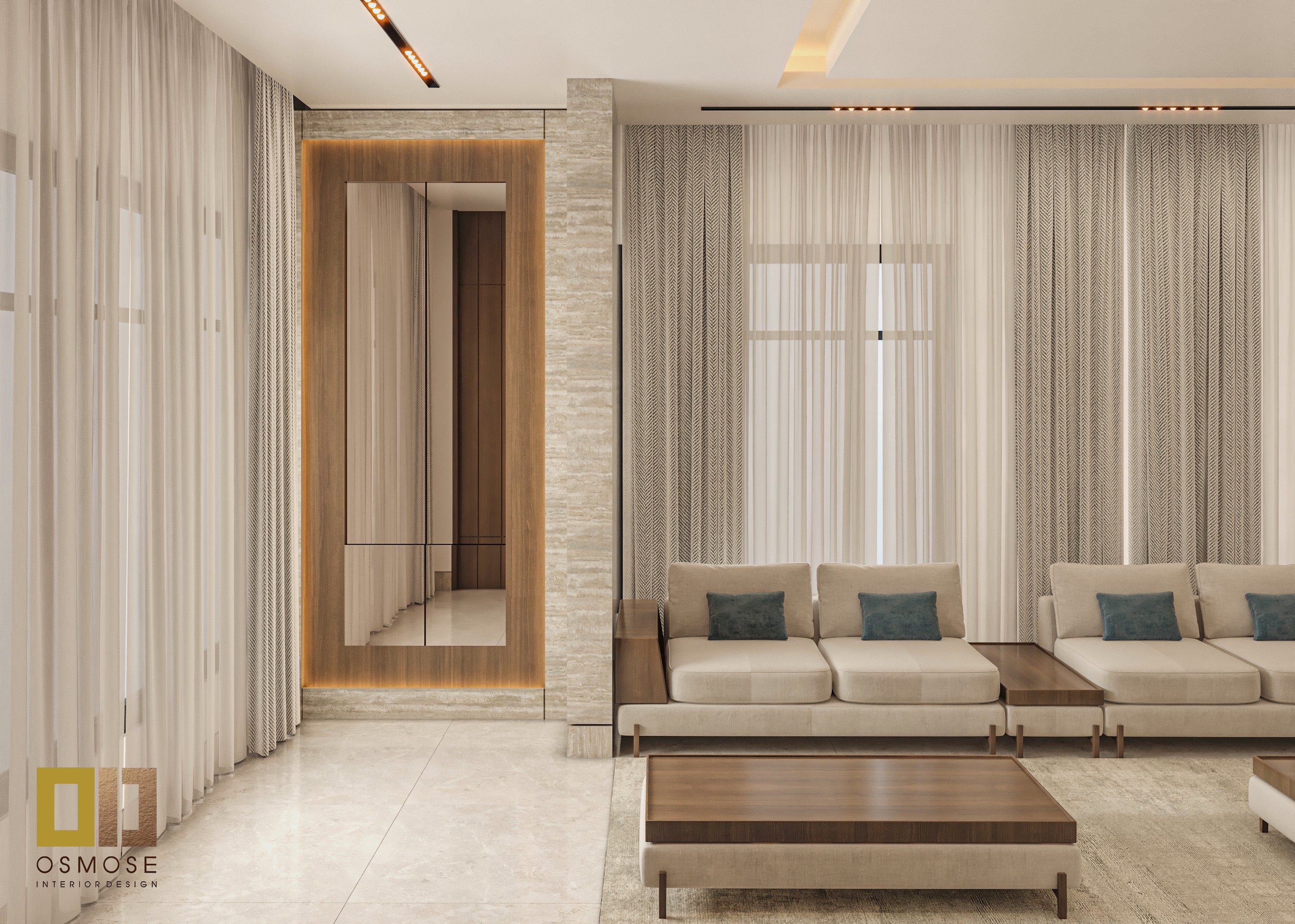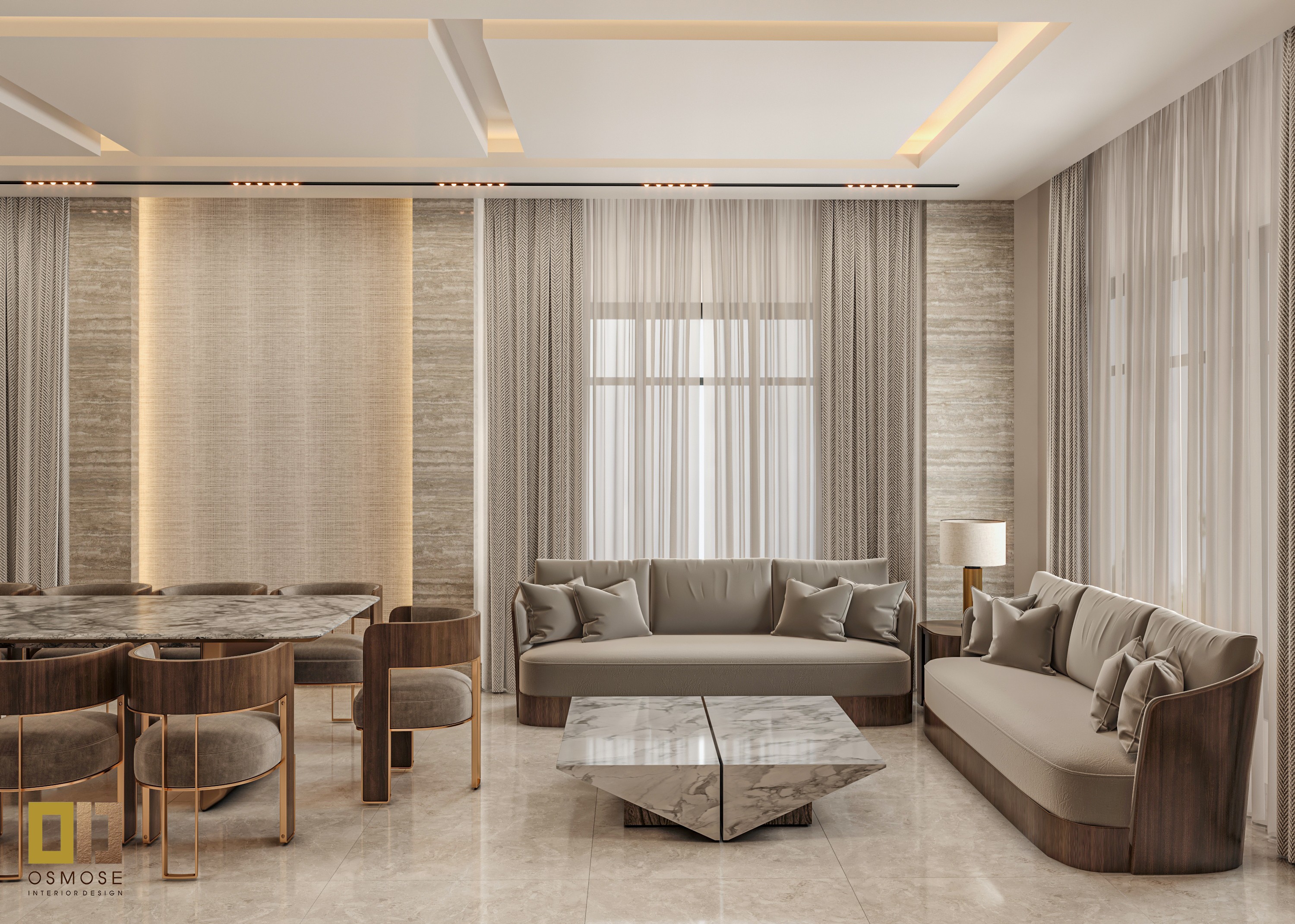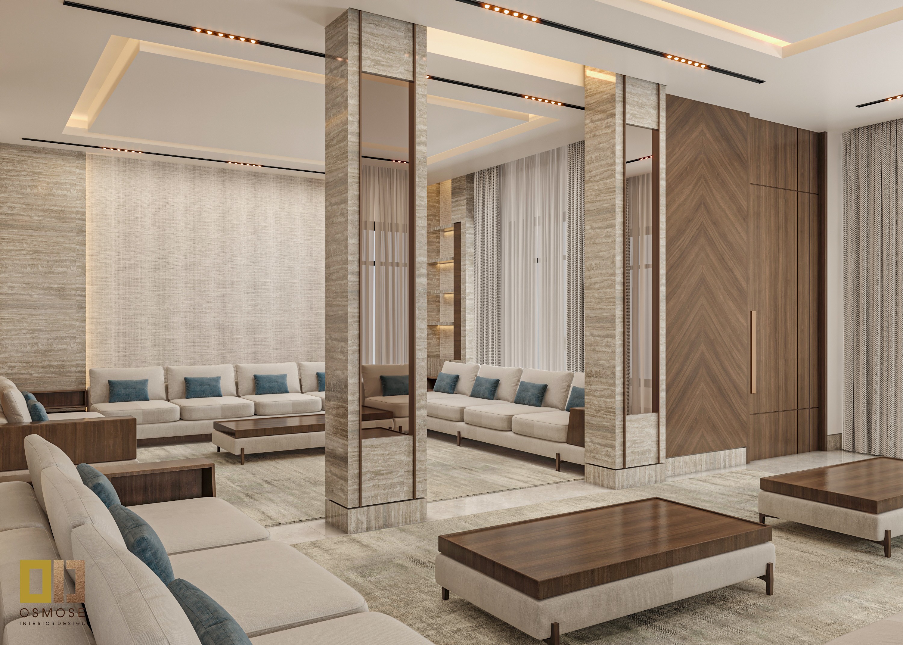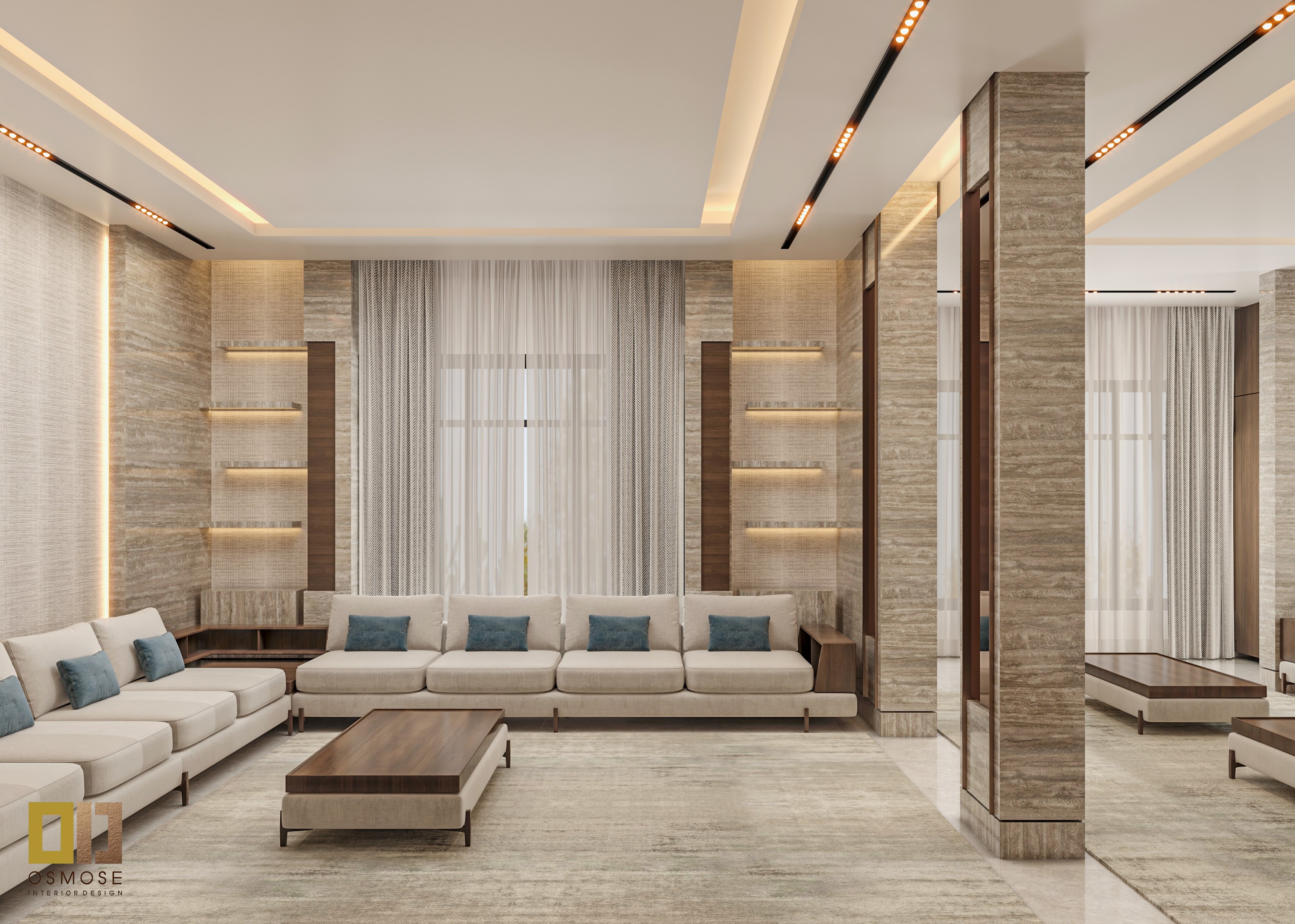 Natural stone finishes, smooth wall surfaces, and fabric-upholstered seating are used throughout the space. Textured curtains and area rugs add warmth and acoustic comfort.