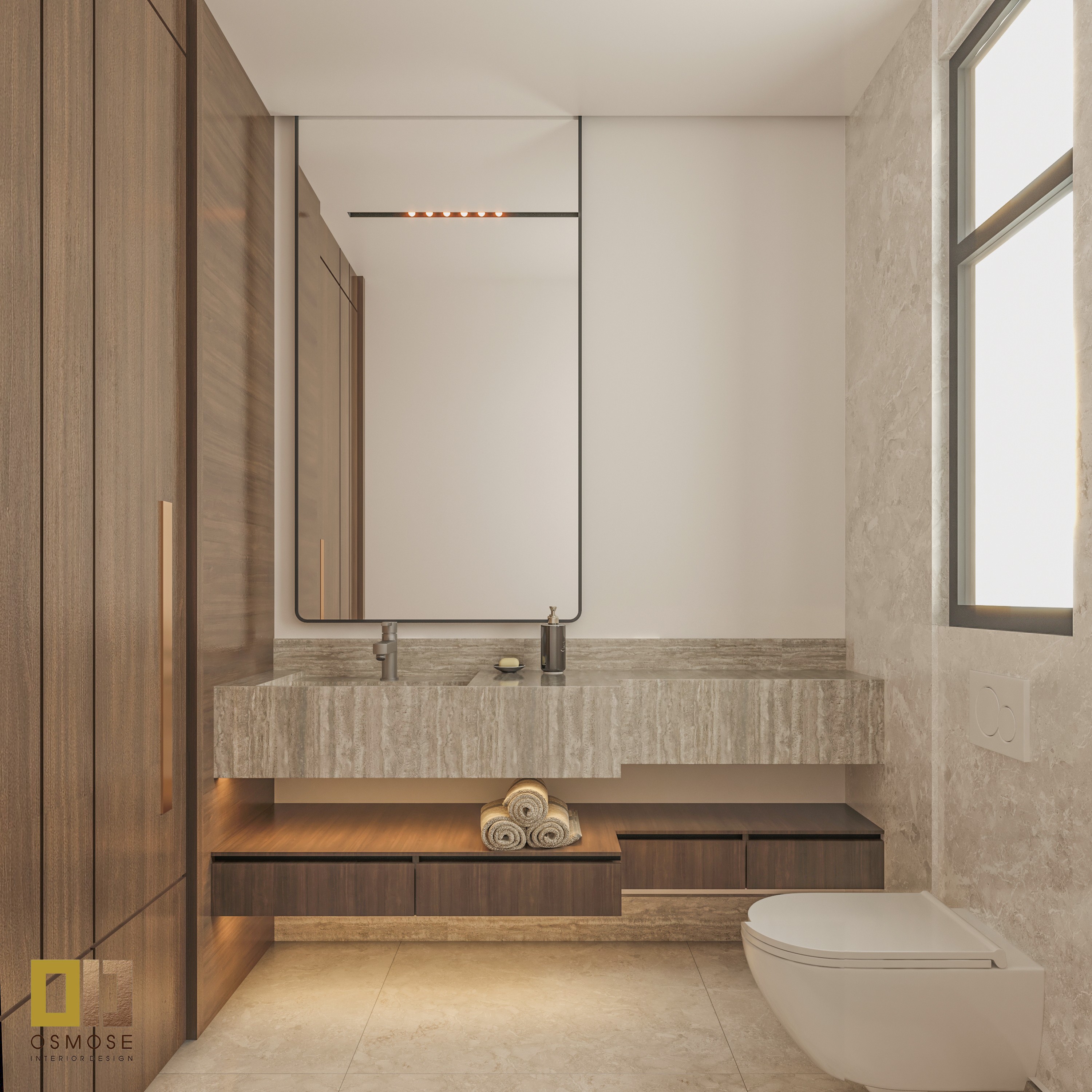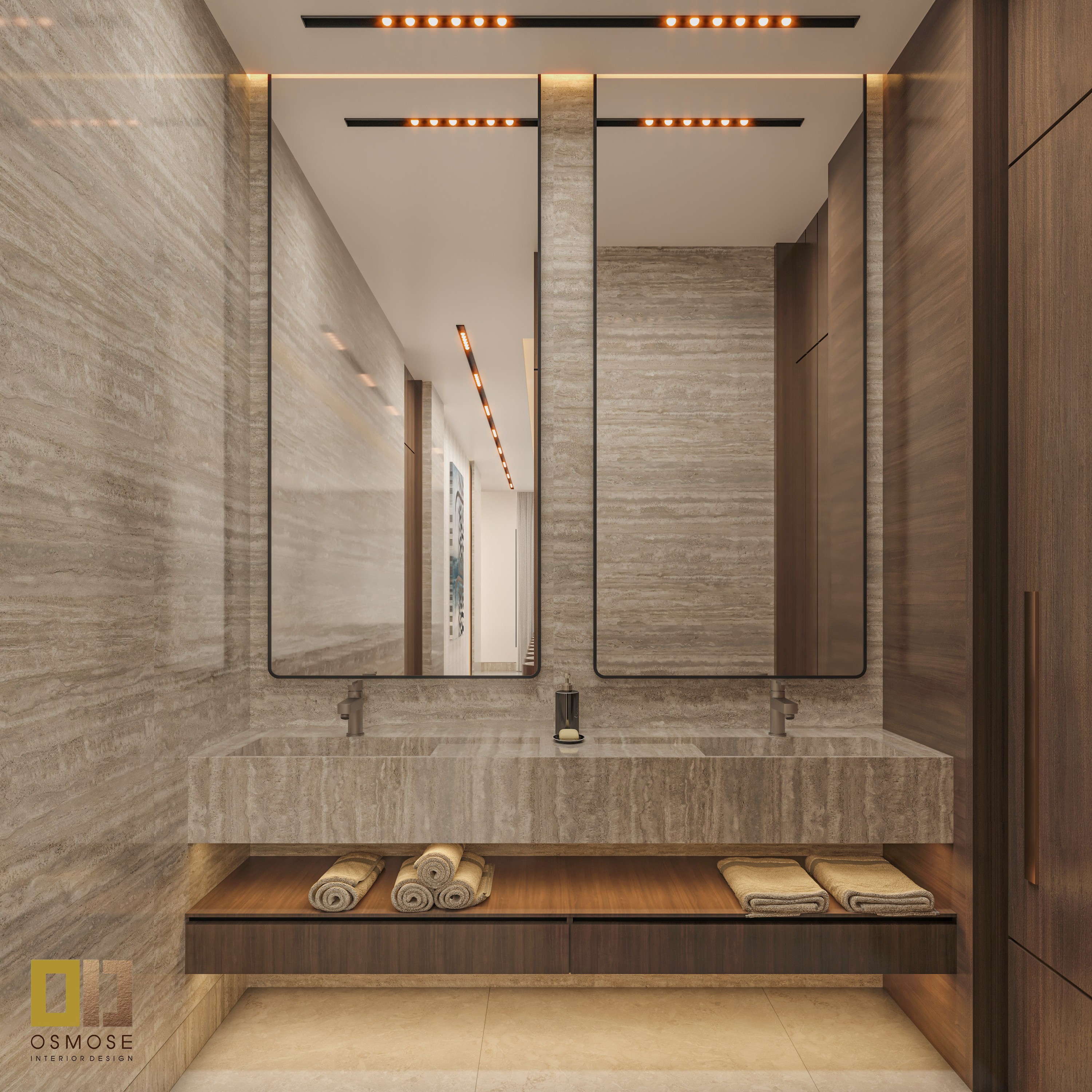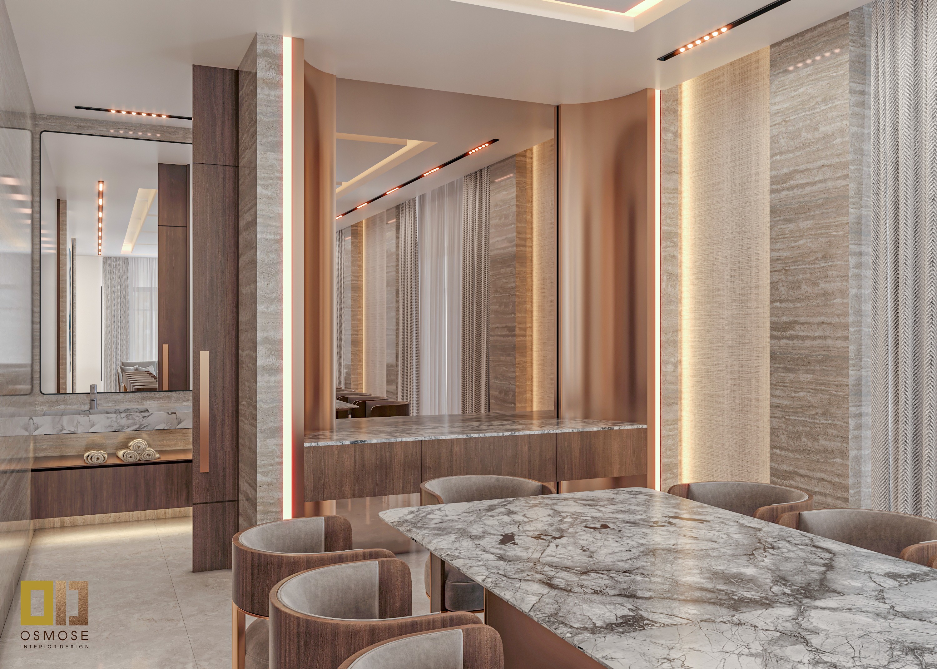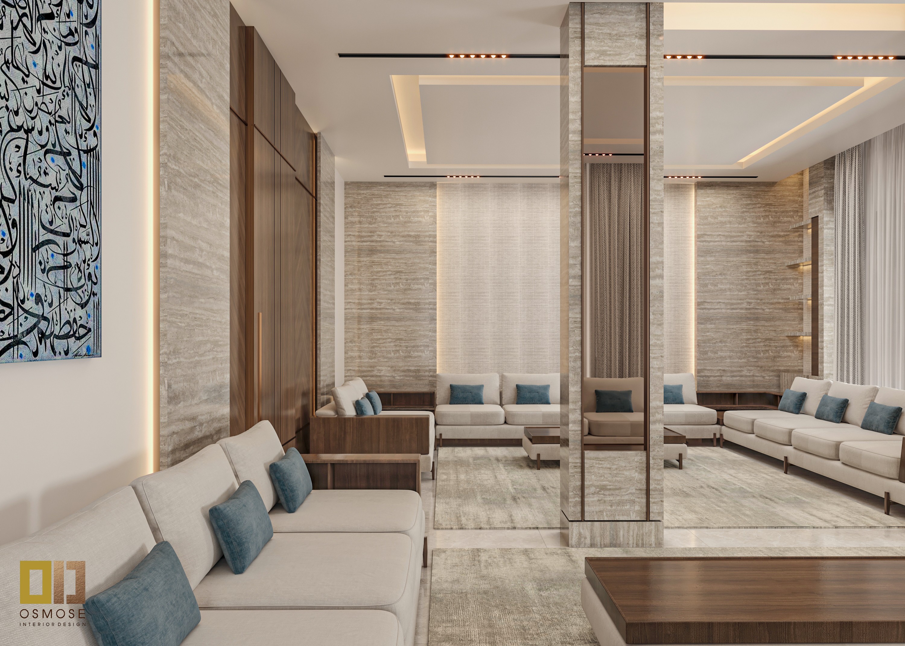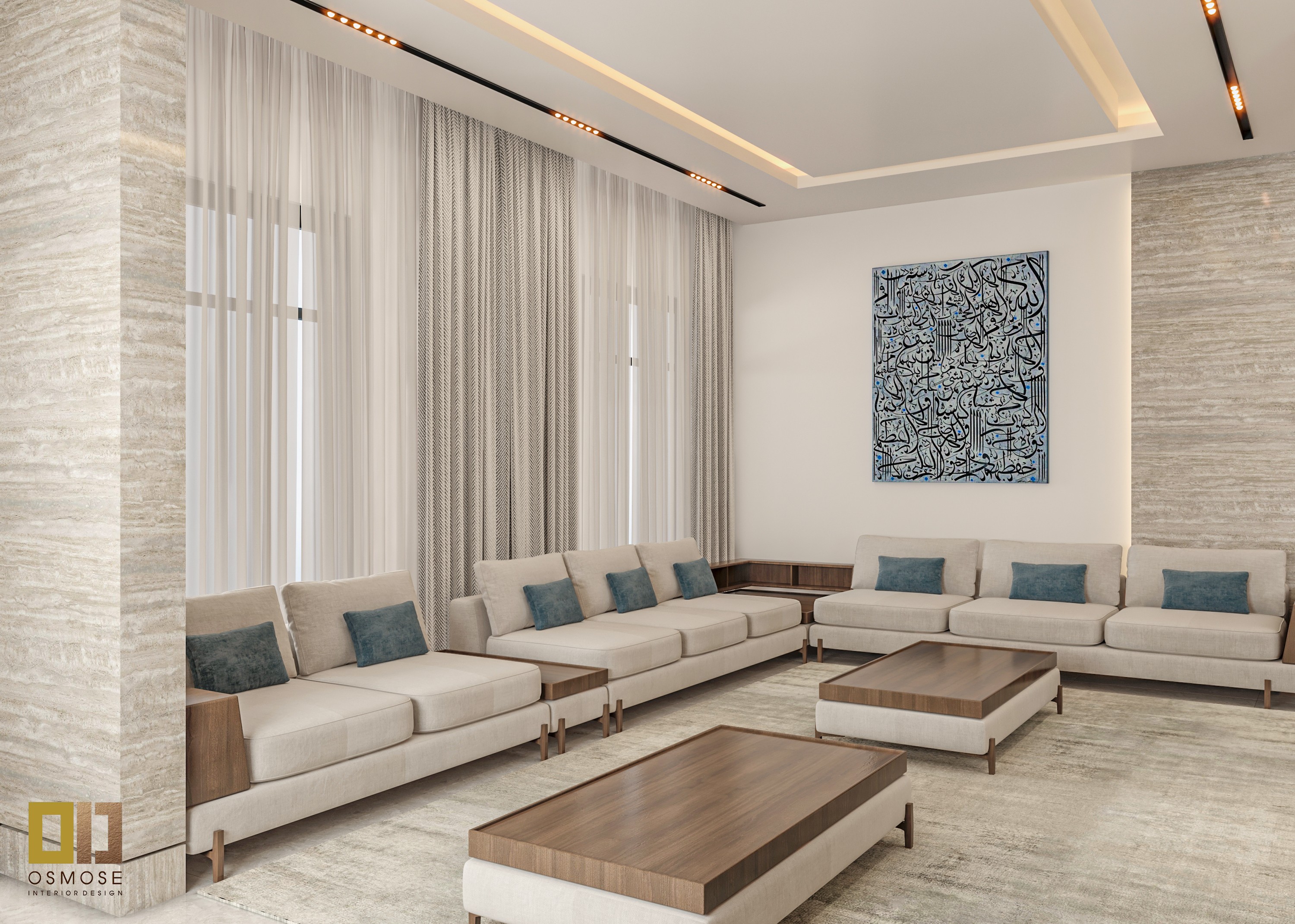 Natural stone finishes, smooth wall surfaces, and fabric-upholstered seating are used throughout the space. Textured curtains and area rugs add warmth and acoustic comfort.