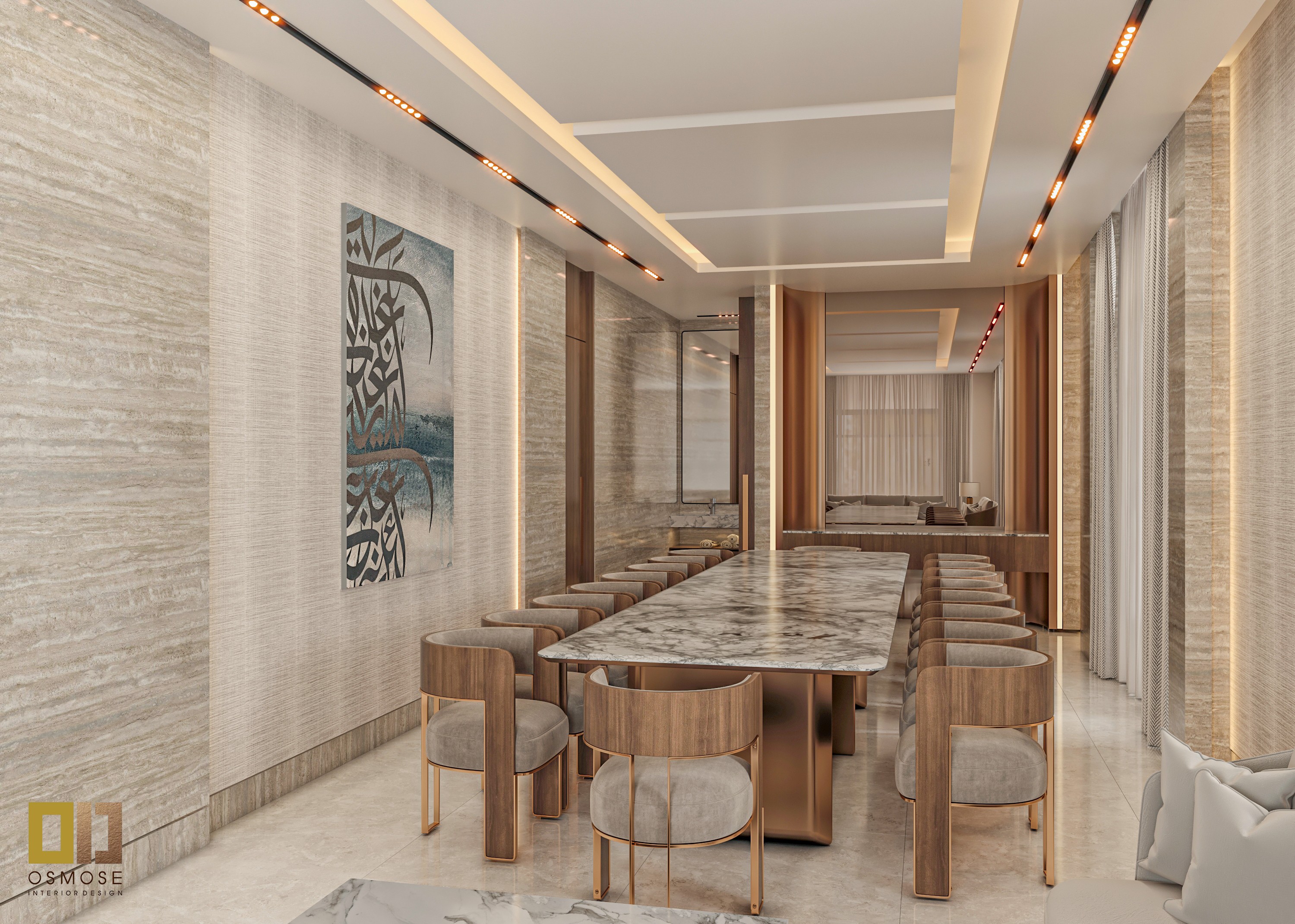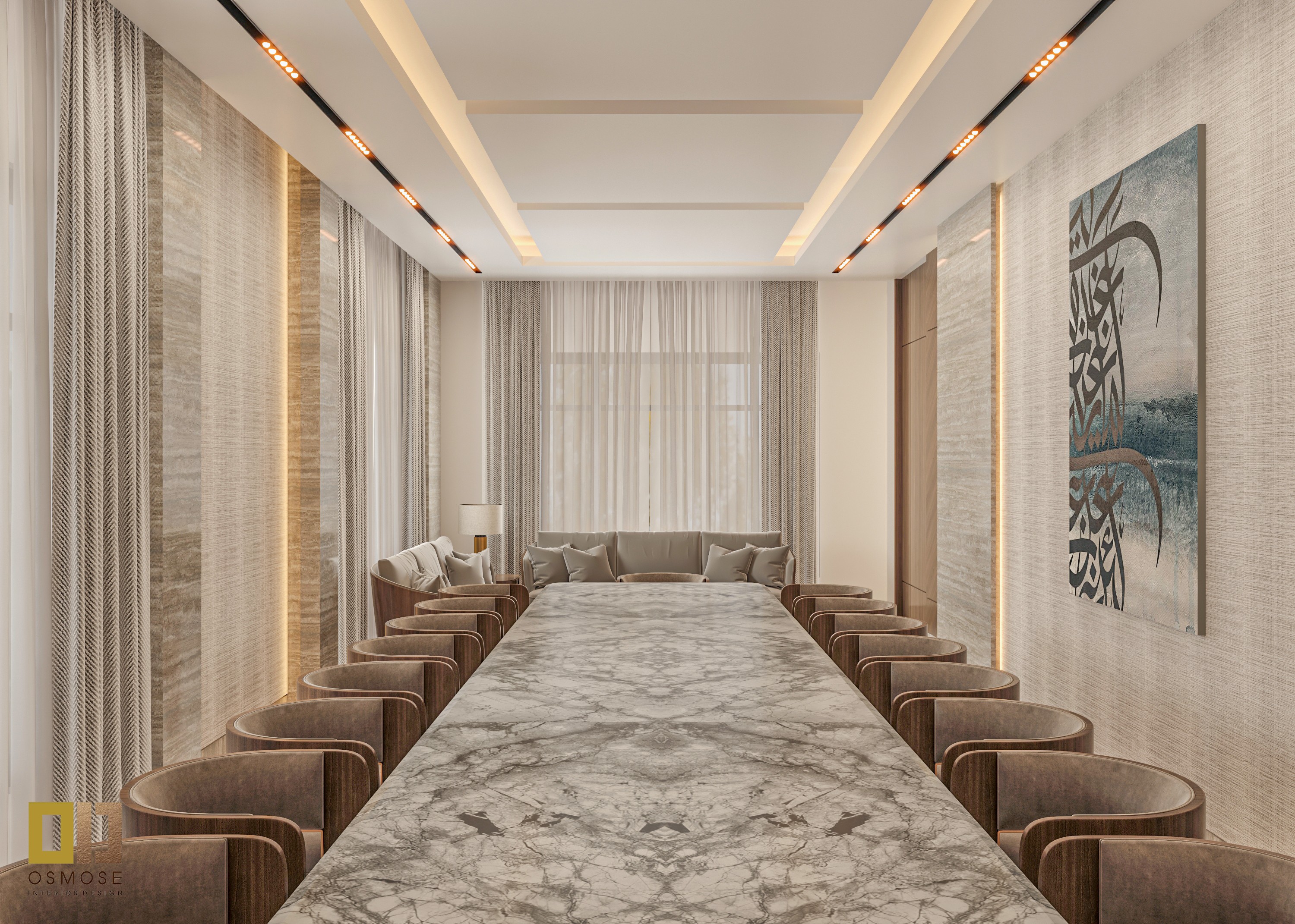 The main seating area is designed as a formal majlis-style space, suitable for meetings, discussions, and guest reception. The linear seating arrangement creates a structured layout while maintaining openness and ease of movement.