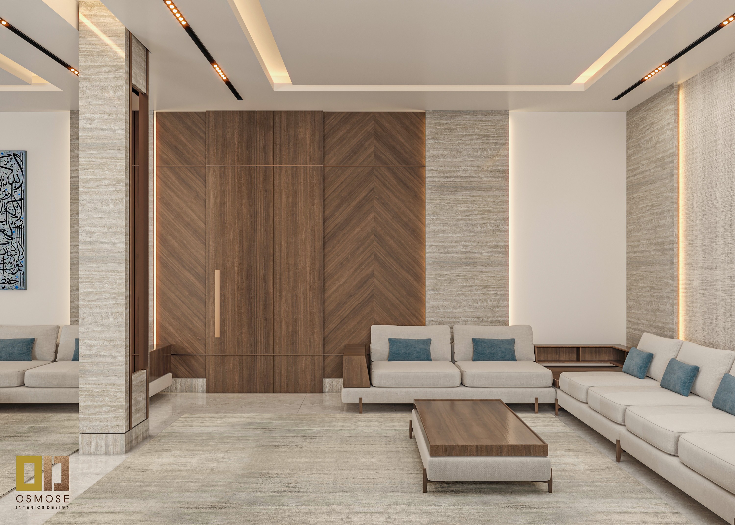 Recessed ceiling lighting and concealed LED strips are used to create even illumination. Accent lighting highlights architectural details and enhances the overall ambiance without glare.