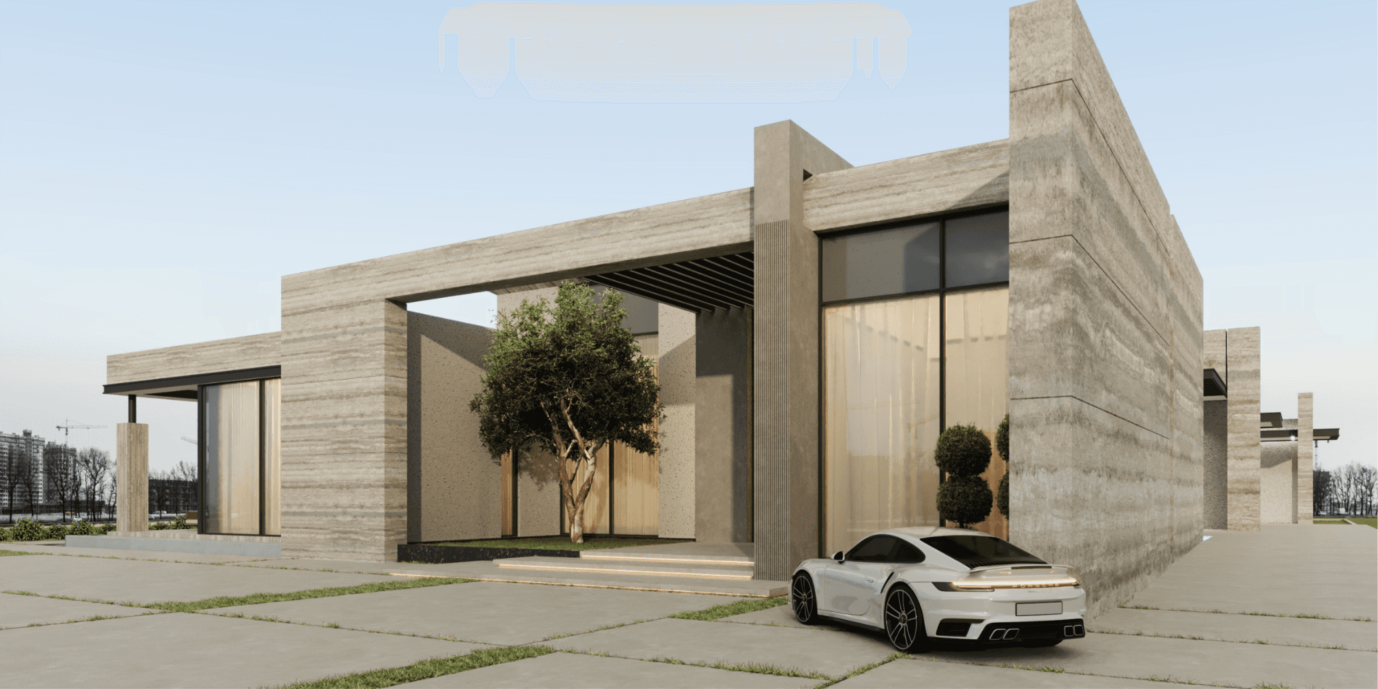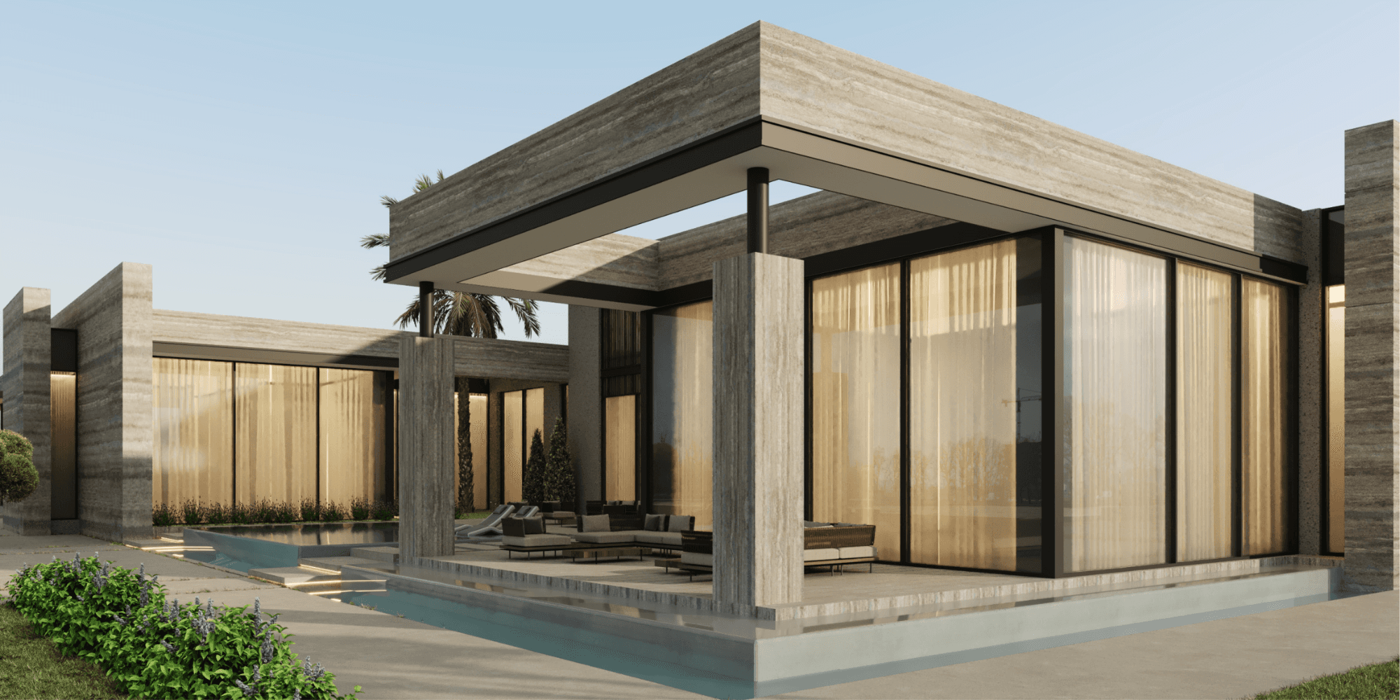 The façade features textured stone cladding, smooth concrete finishes, and large glazed panels. These materials are selected for durability, elegance, and their ability to age gracefully over time.