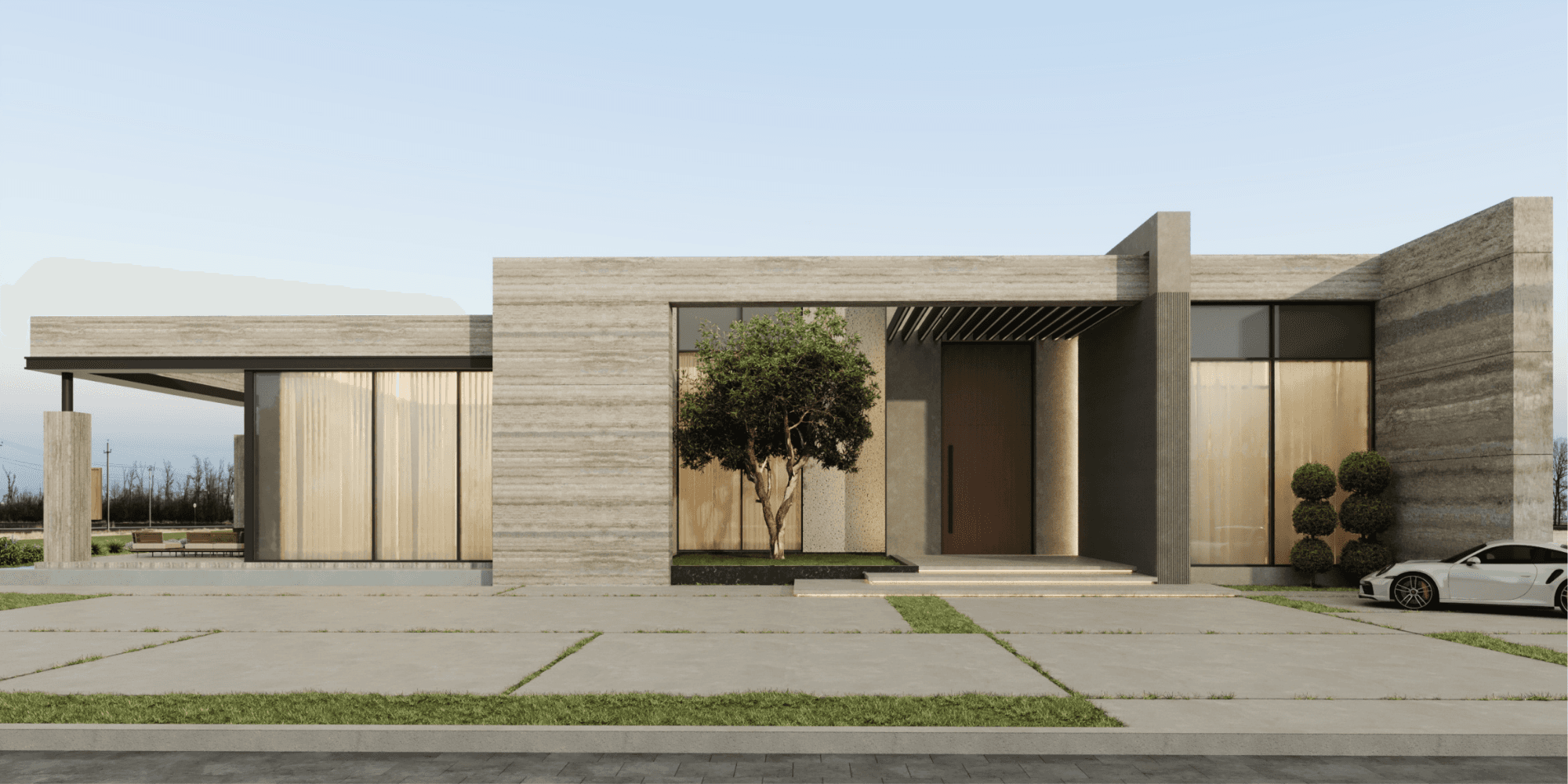 Concealed architectural lighting highlights façade lines, entrance volumes, and landscape elements. Evening illumination enhances the villa’s form while maintaining a soft, sophisticated ambiance.