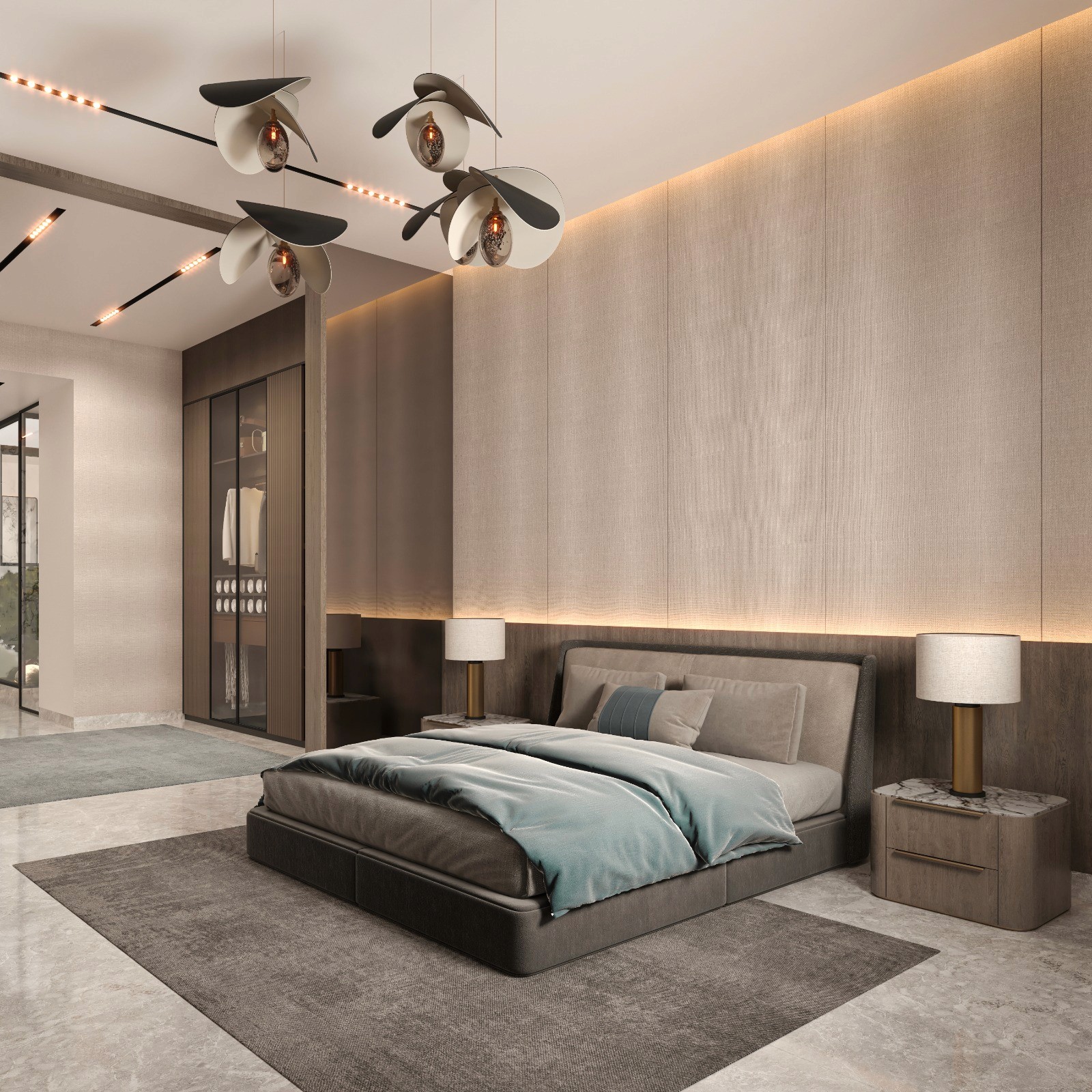 Minimalist bedroom furniture with clean profiles is selected to enhance comfort and functionality. Accessories are intentionally kept minimal to preserve visual clarity and sophistication.