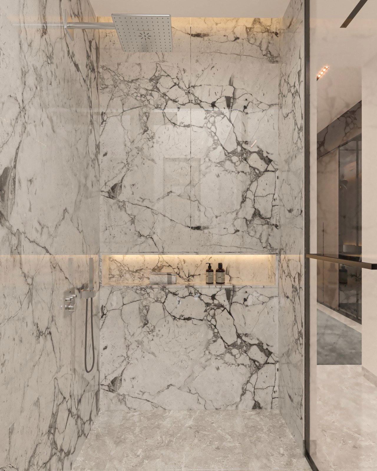 The bedroom connects smoothly to the wardrobe area through a well-defined transition zone. Glass-front wardrobes and soft lighting enhance depth while maintaining a refined and organized appearance.