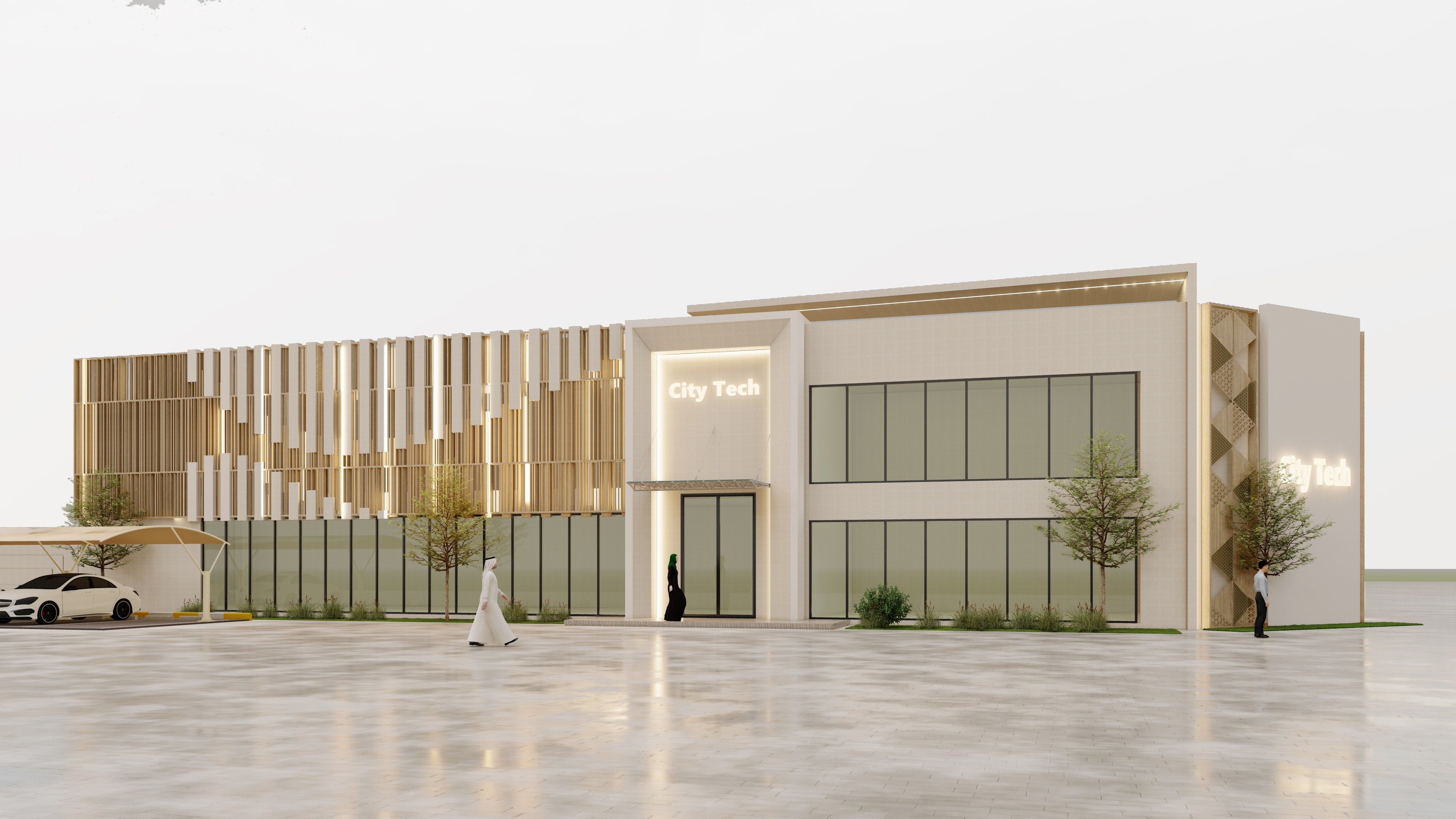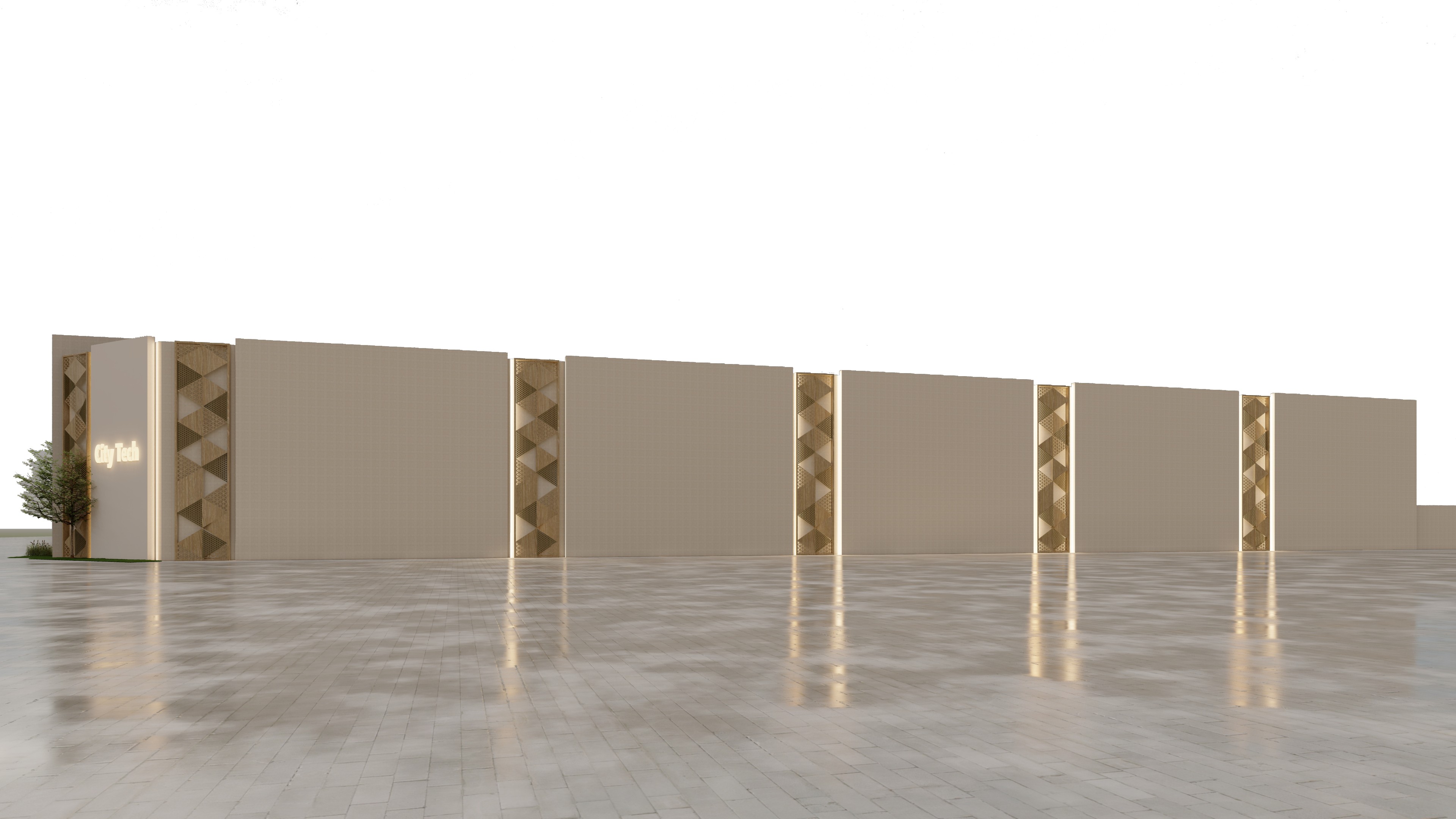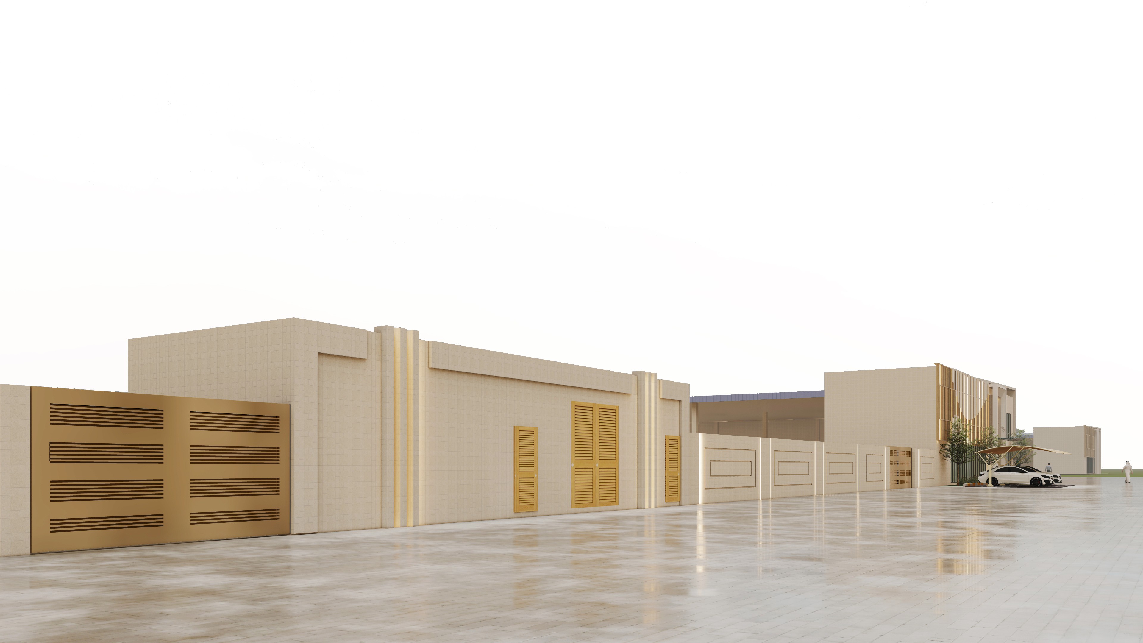 The main entrance is highlighted through vertical architectural elements and lighting integration, creating a welcoming and recognizable arrival point. Pedestrian and vehicular movements are clearly separated to improve safety and circulation.