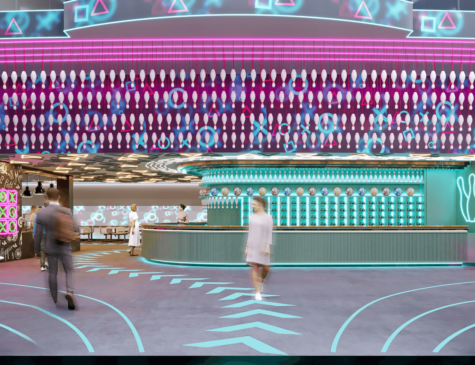 The main hall is designed as an open, dynamic space that visually connects bowling lanes, seating zones, and entertainment areas. Curved architectural forms and illuminated ceiling features create a sense of motion and excitement throughout the space.