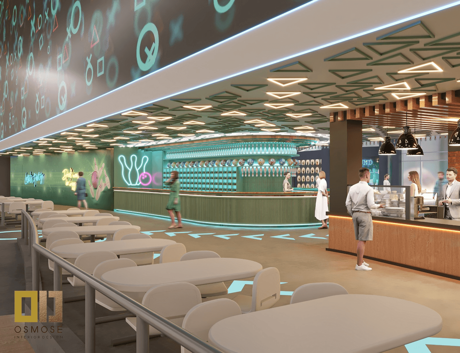 Integrated seating zones are positioned along the circulation paths, allowing visitors to relax, socialize, and observe the activity around them. The seating design combines comfort with bold, contemporary aesthetics.