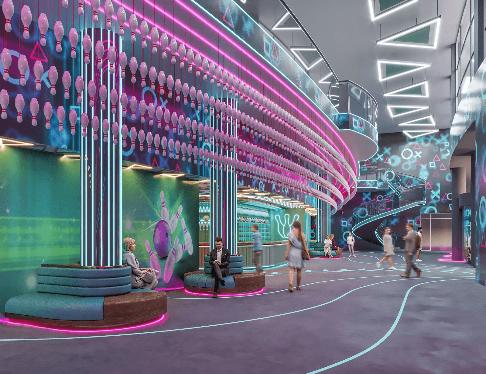 Graphic feature walls and illuminated installations enhance the immersive experience. The visual elements reinforce the entertainment theme while serving as focal points within the interior.
