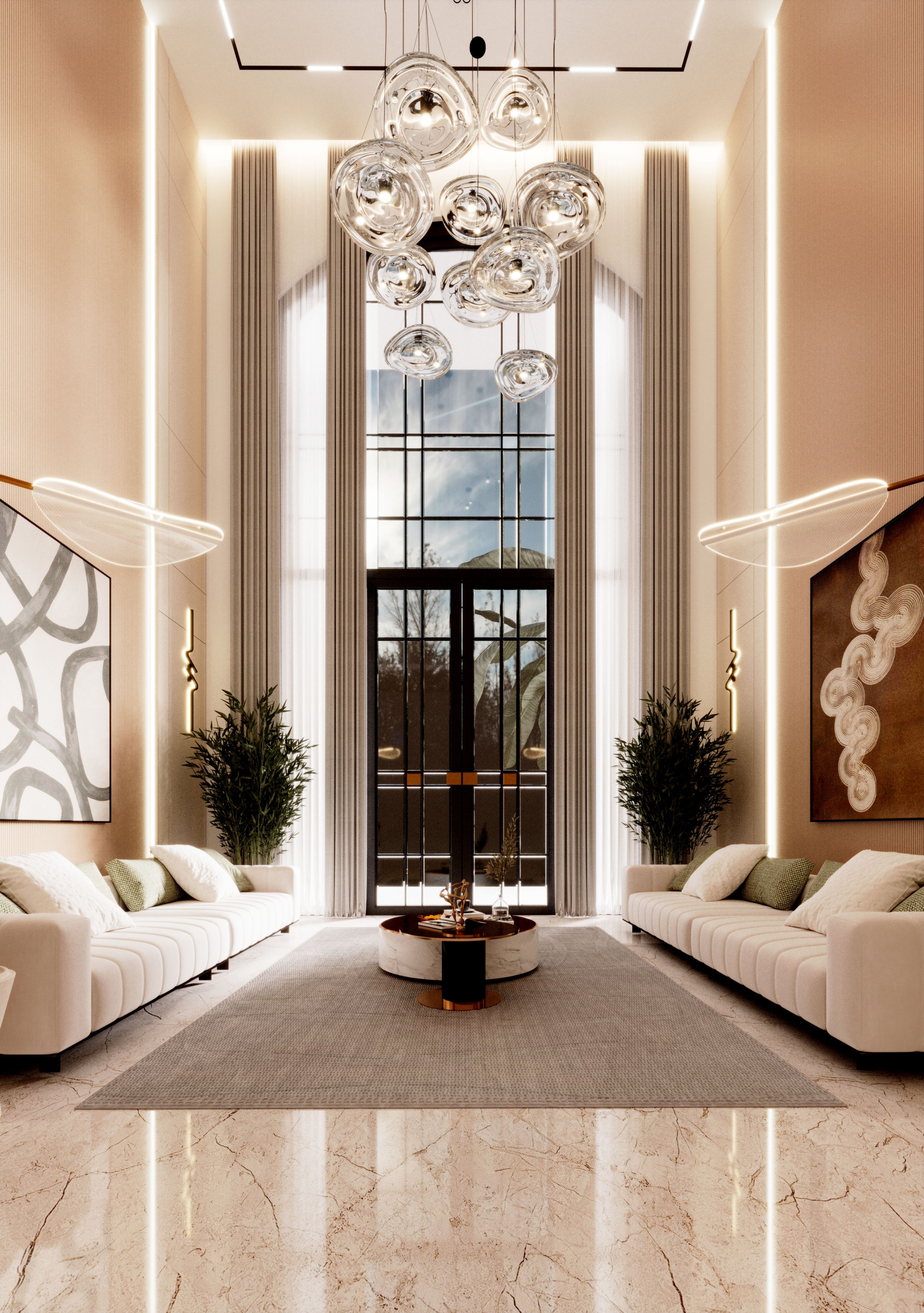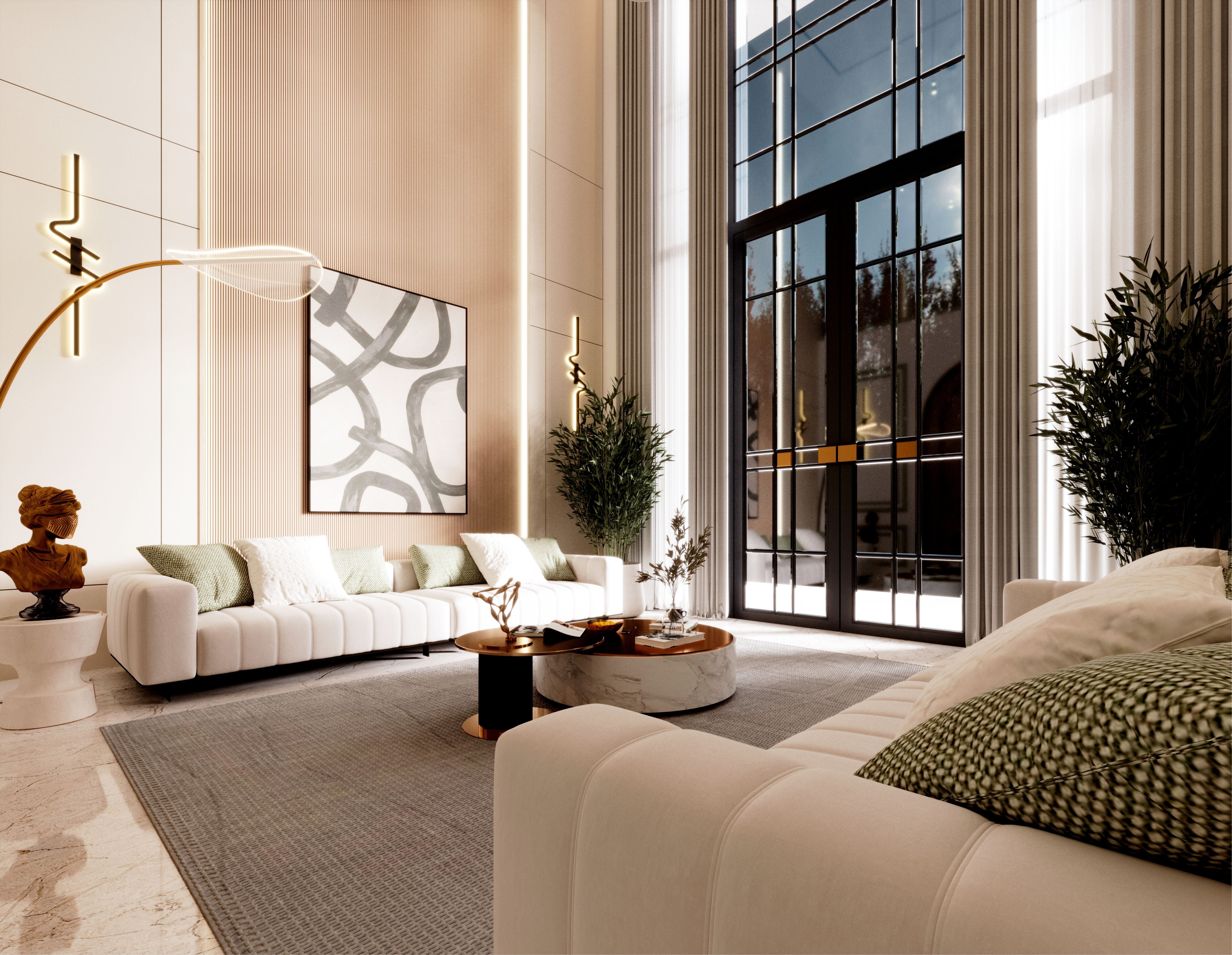 Custom-selected sofas, a stone-finish coffee table, and minimal decorative elements contribute to a refined yet lived-in feel. Accessories are intentionally minimal to maintain clarity and elegance.