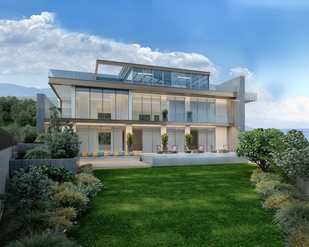 Comfort-oriented seating, minimal side tables, and discreet storage elements are selected to support functionality without clutter. Accessories are intentionally limited to maintain visual clarity.