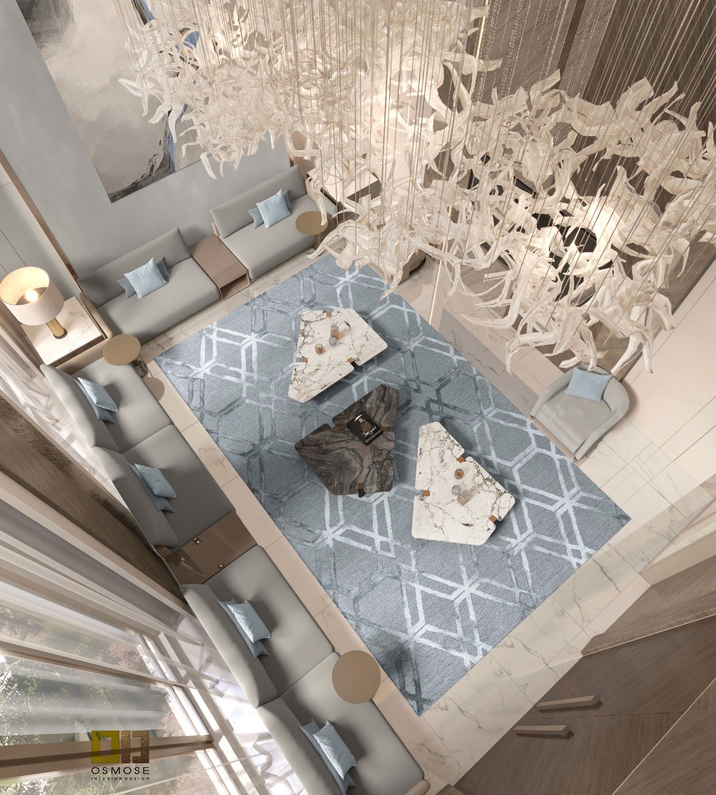 The double-height ceiling enhances the sense of luxury and openness. A feature wall with artistic detailing acts as a visual focal point, complemented by a statement chandelier that emphasizes the vertical scale of the space.