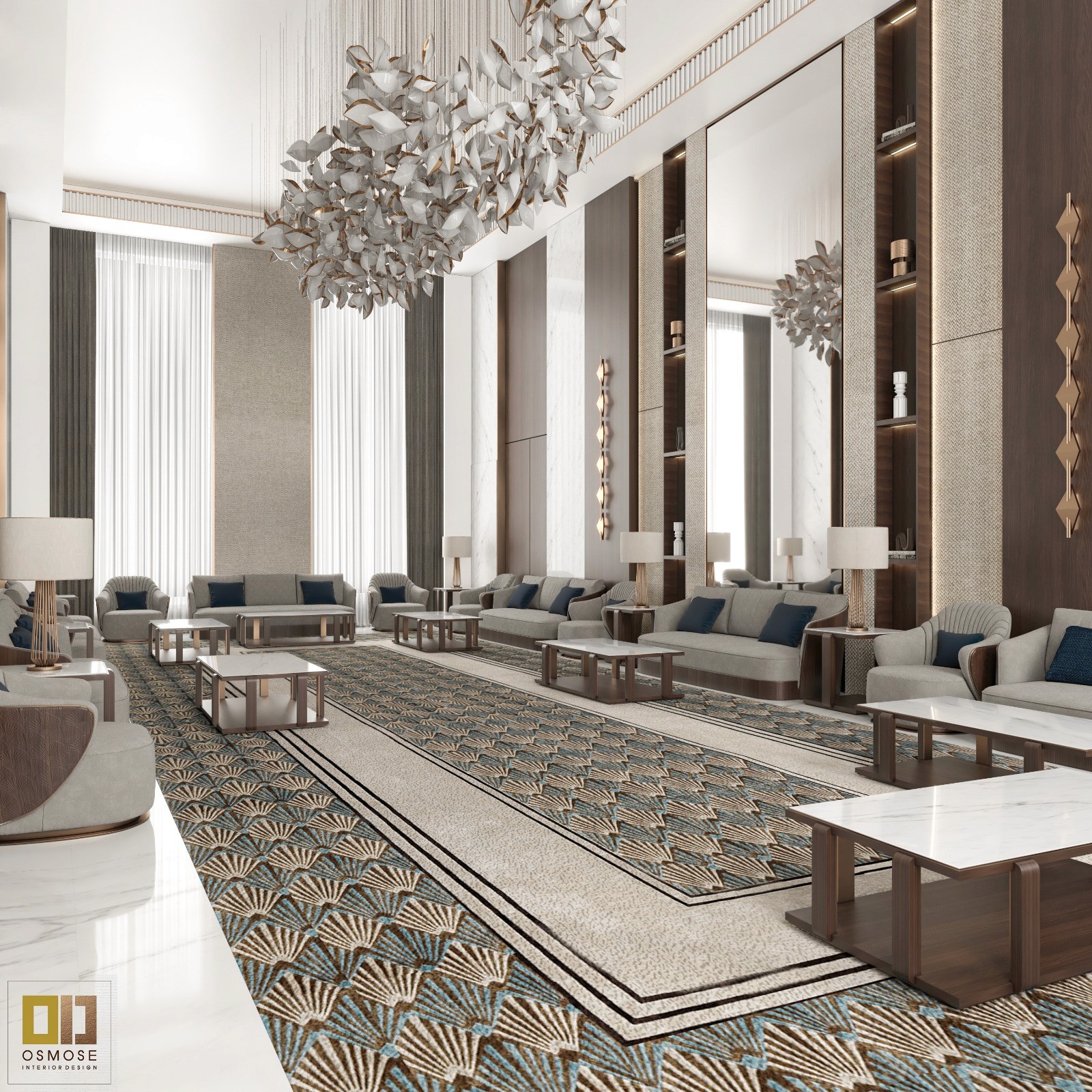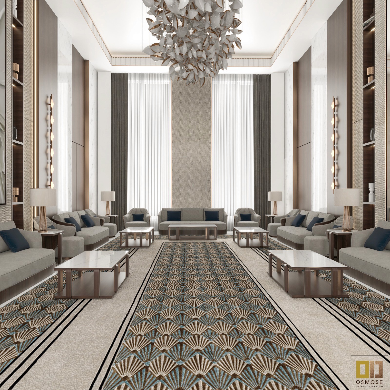The main majlis is planned as an expansive and symmetrical seating space, allowing guests to engage comfortably in conversation. Continuous seating along the perimeter enhances capacity while maintaining openness at the center.
