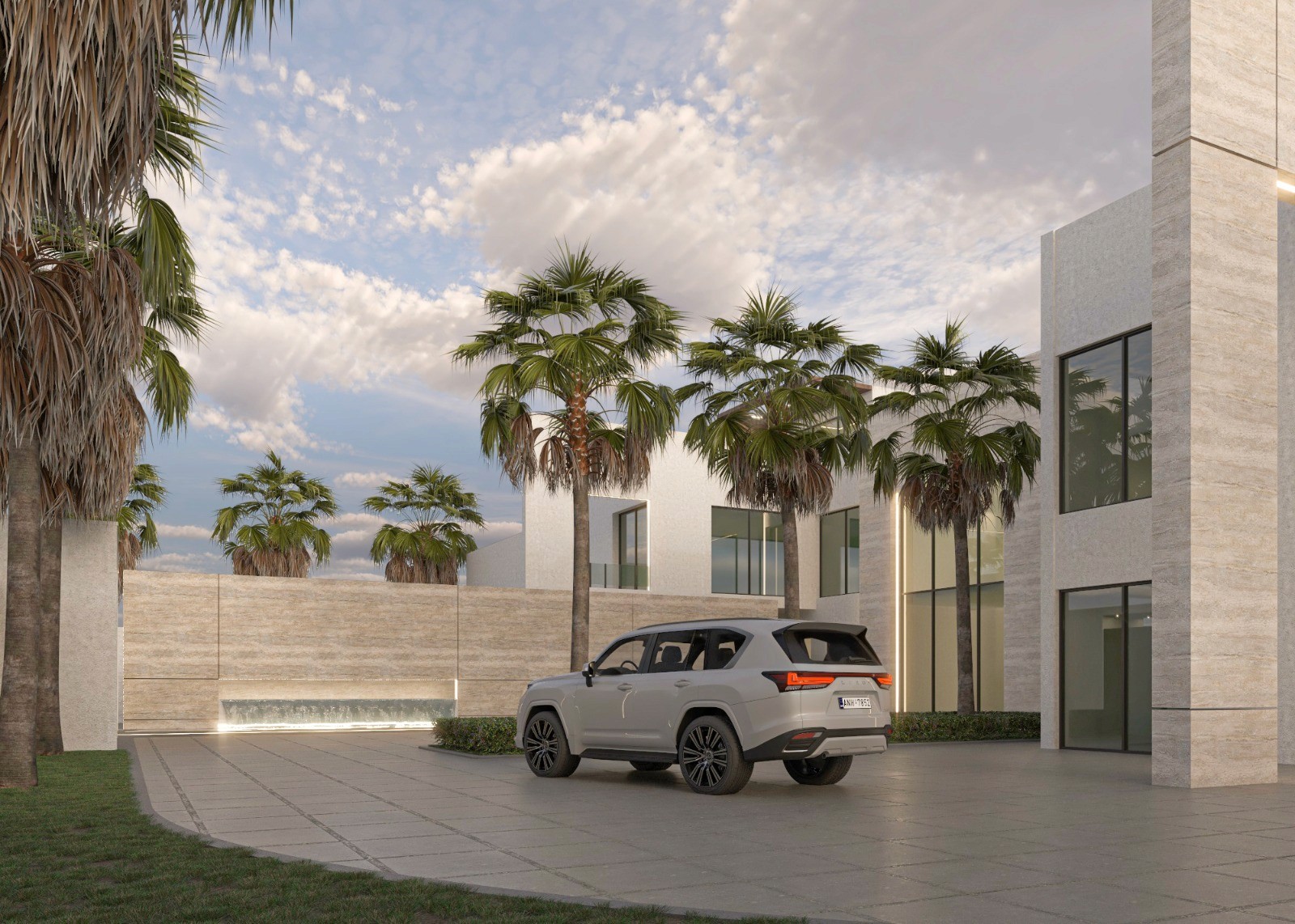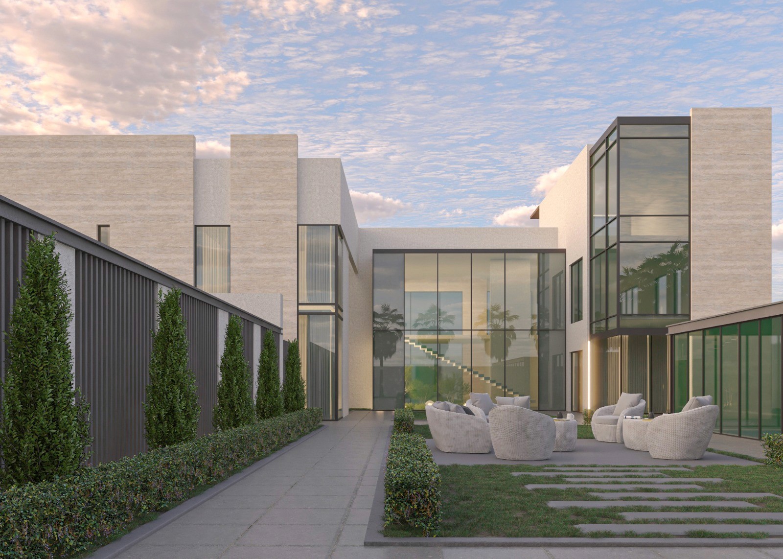 The main entrance is emphasized through double-height glazing and subtle architectural lighting. The arrival sequence is designed to feel open and welcoming while maintaining a sense of exclusivity and privacy.