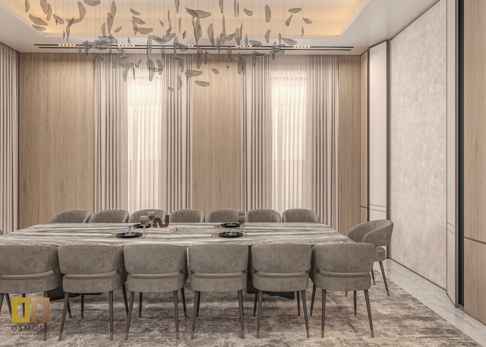 The dining area is visually connected to the living space, separated subtly through furniture placement and ceiling treatment. This ensures smooth circulation and a cohesive spatial experience.