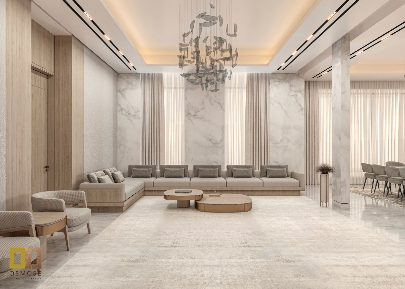 The living area is designed as a grand yet comfortable space, anchored by a long, continuous seating arrangement that encourages conversation and relaxation. The open layout allows flexibility while maintaining a strong sense of order and balance.