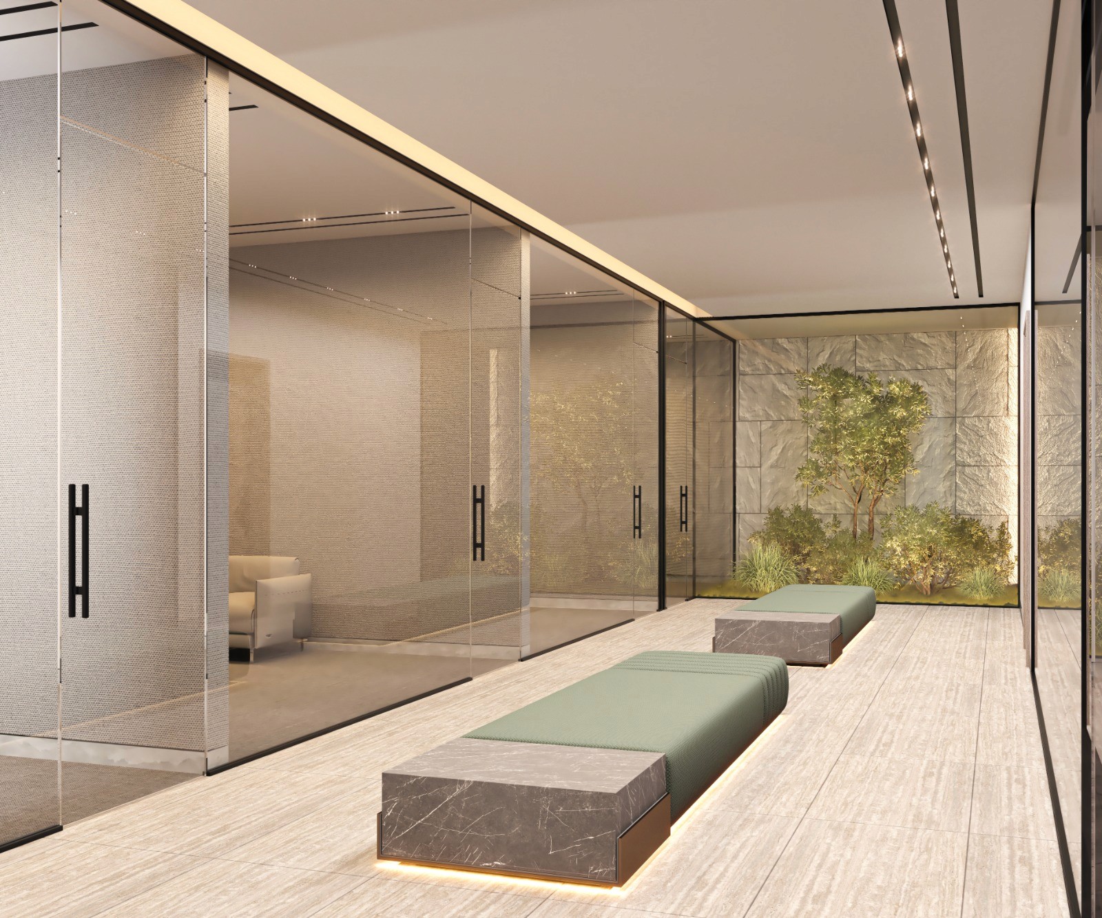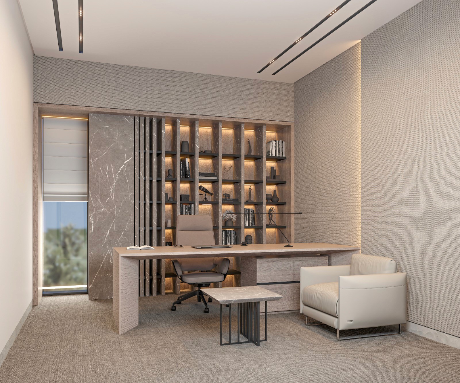 The interior incorporates textured wall finishes, natural stone surfaces, and warm wood elements. These materials were selected to convey durability, elegance, and a premium feel suitable for an executive office.