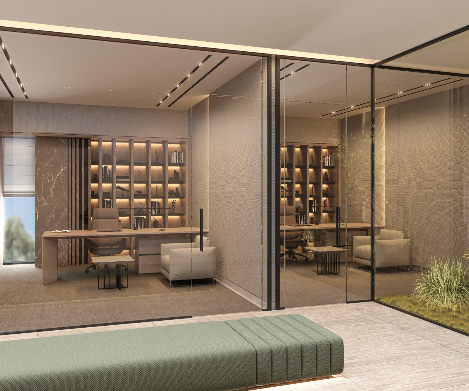 The executive office is designed as a composed and well-structured workspace. The central desk anchors the room, creating a clear focal point while allowing efficient movement and accessibility.